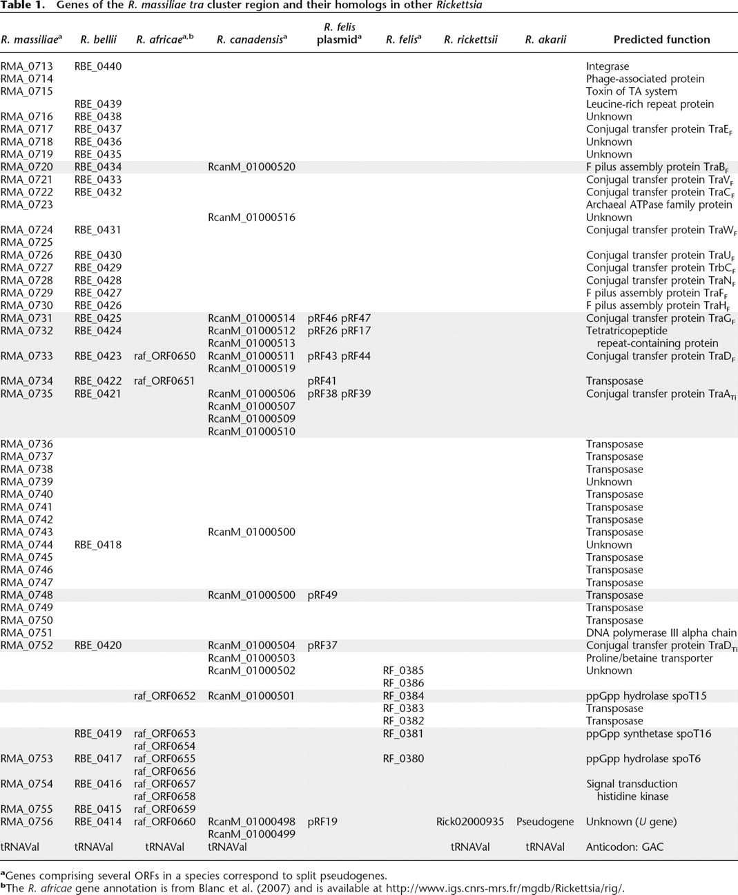 bThe R. africae gene annotation is from Blanc et al. (2007) and is available at http://www.igs.cnrs-mrs.fr/mgdb/Rickettsia/rig/.