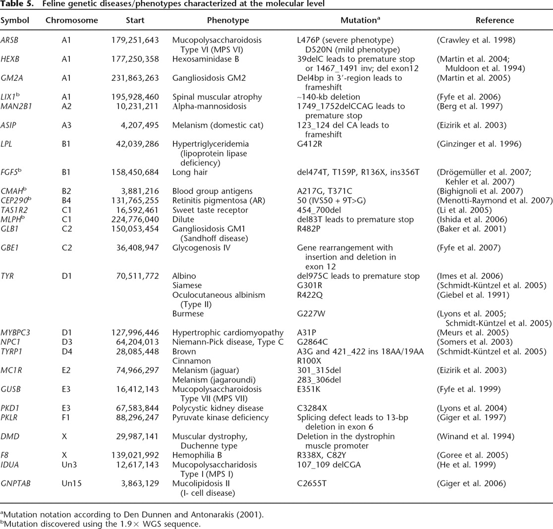 Feline genetic diseases/phenotypes characterized at the molecular level