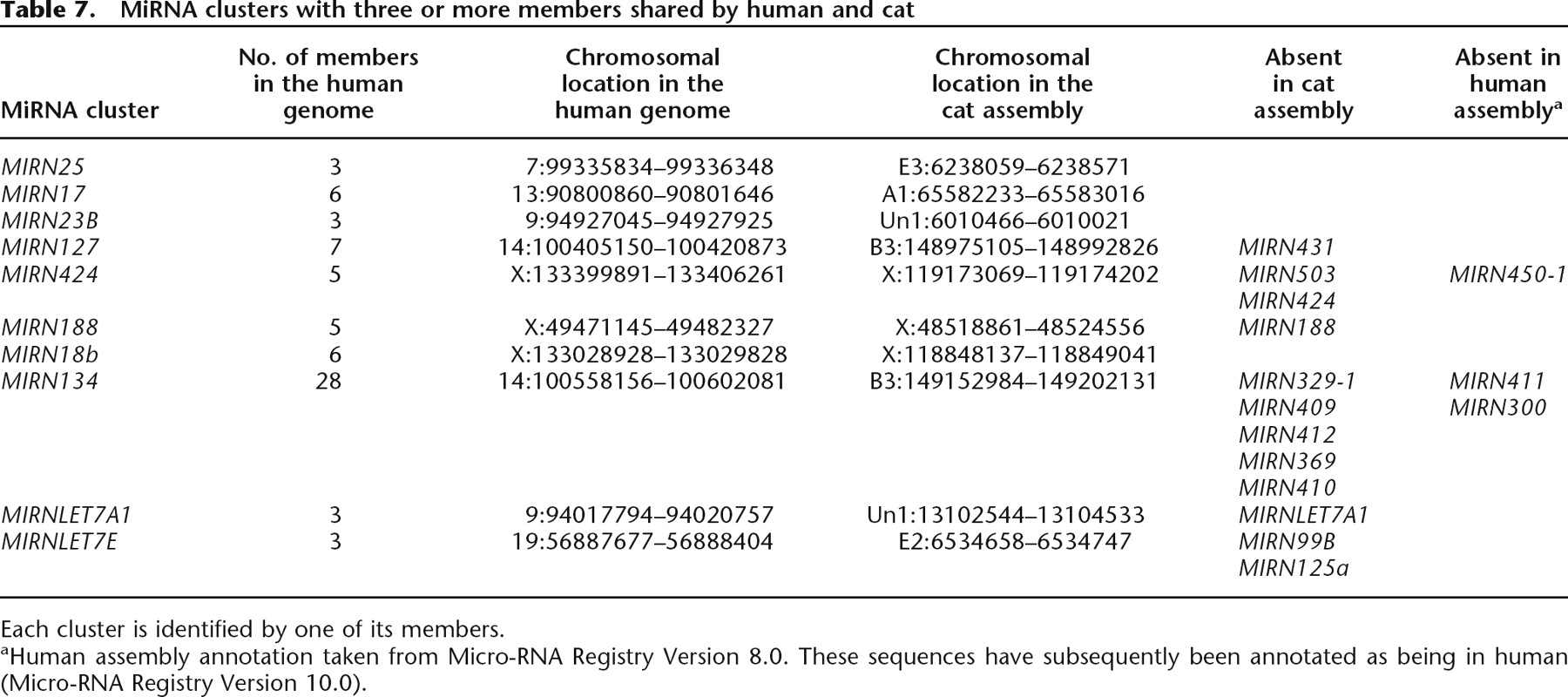 aHuman assembly annotation taken from Micro-RNA Registry Version 8.0. These sequences have subsequently been annotated as being in human (Micro-RNA Registry Version 10.0).