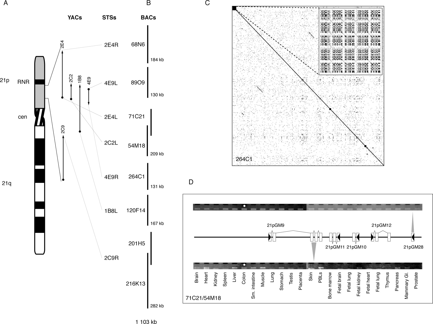 Isolation and analysis of 21p BACs. (A) Location of YACs (Wang et al. 1999) and seven STS probes used for screening the CHORI-507 library. (B) Eight BACs identified with 21p STSs from the CHORI-507 library were sequenced. The order shown is based on the order of the STS probes. (C) Dotplot of BAC 264C1 shows that there are no large regions of satellite or highly repetitive sequence. (Inset) Magnification of the first 1500 bp shows that there is a small region of satellite III at one end of the clone. The pattern of satellite III as a variable number of (ATTCC) repeats separated by a ∼10-bp consensus (Prosser et al. 1986) can be seen. (D) Schematic of the five gene models identified within BACs 71C21/54M18. RT-PCR expression patterns of 21pGM9 and 21pGM28 are shown. White boxes represent exons; black arrowheads indicate transcription direction.