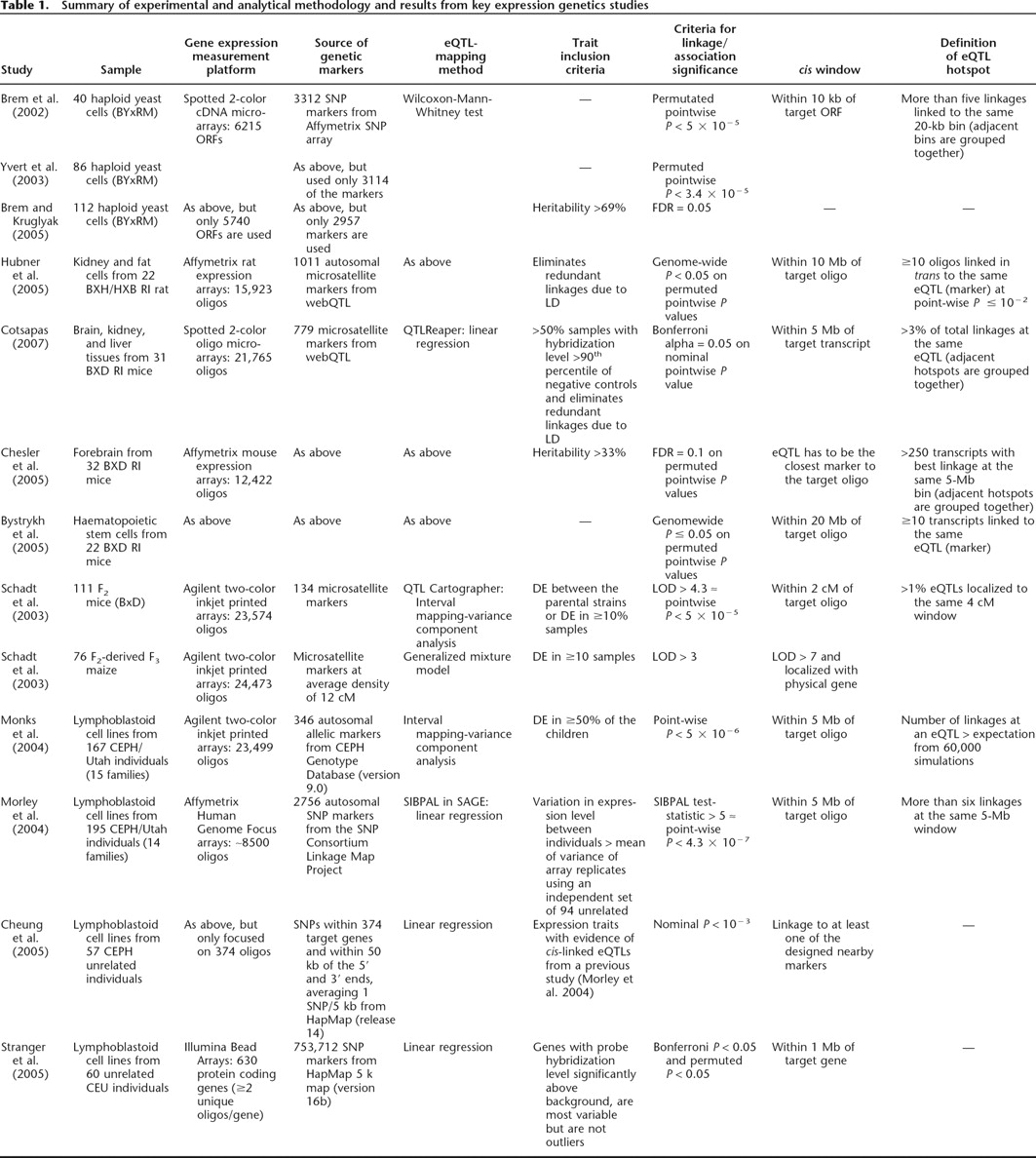 Summary of experimental and analytical methodology and results from key expression genetics studies