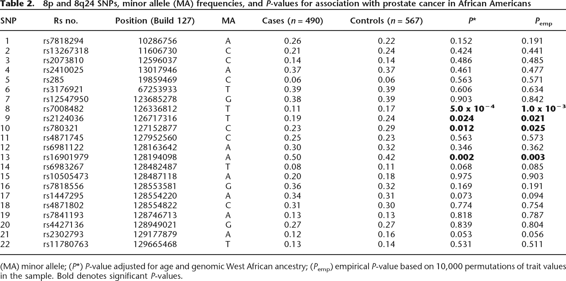8p and 8q24 SNPs, minor allele (MA) frequencies, and P-values for association with prostate cancer in African Americans