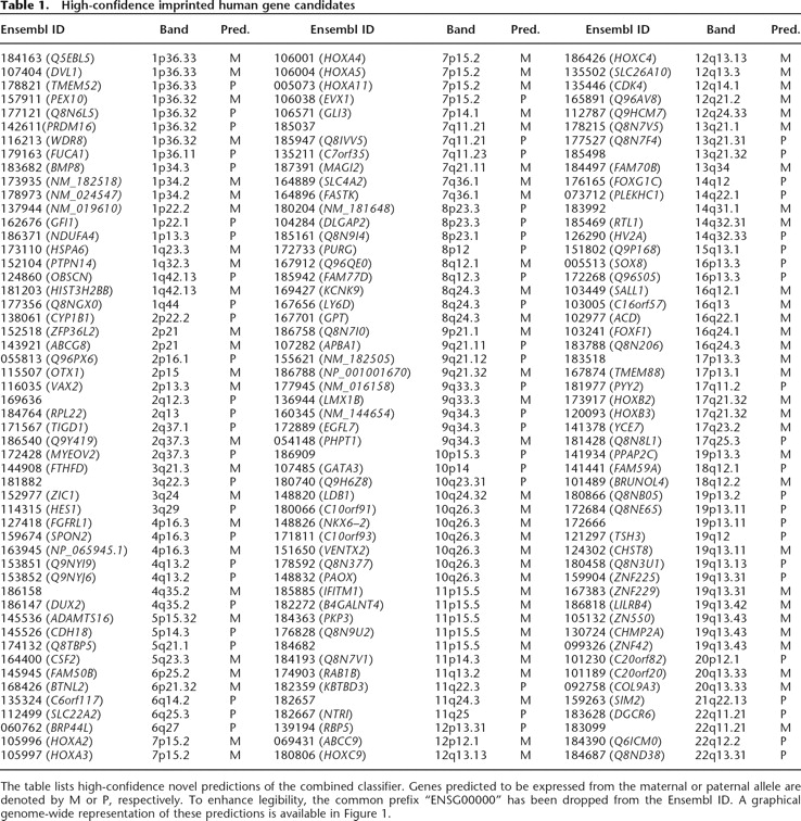 The table lists high-confidence novel predictions of the combined classifier. Genes predicted to be expressed from the maternal or paternal allele are denoted by M or P, respectively. To enhance legibility, the common prefix “ENSG00000” has been dropped from the Ensembl ID. A graphical genome-wide representation of these predictions is available in Figure 1.