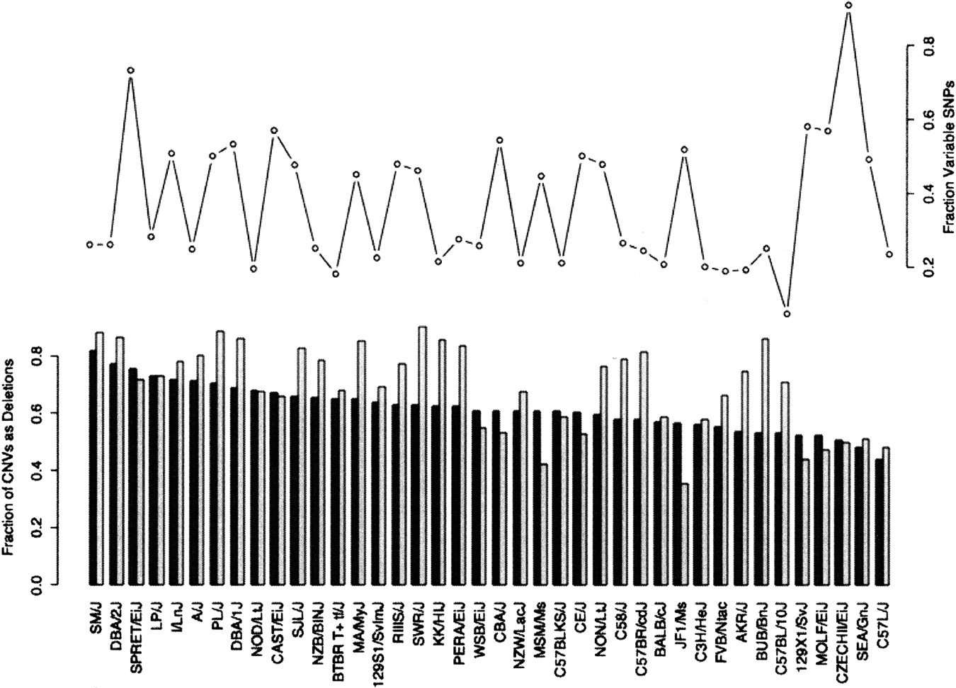 Deletion excess does not correlate with SNP content. A bar plot shows the fraction of all CNVs per strain which are deletions by number (black bars) or total length (white bars), sorted by decreasing deletion number fraction. The line plot shows the fraction of known SNPs between each strain and the reference, which vary.