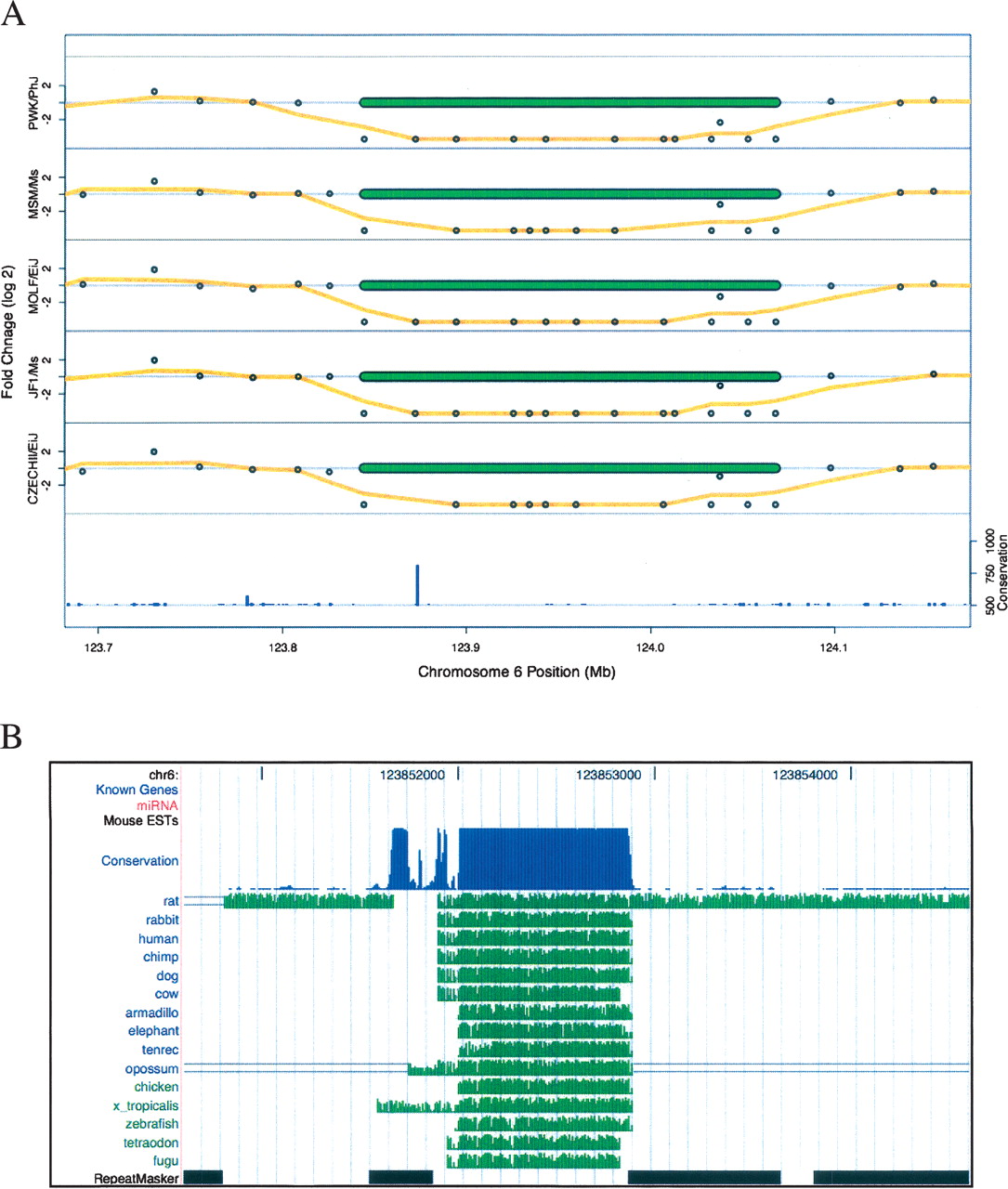 Deletions in five strains remove a highly conserved element on chromosome 6. (A) The log2 values of CGH probe fold-change values are shown as points along with their running mean (window size = 3) as an orange line for each of five strains. Extreme fold-changes are truncated at ±20 (log2 of ±4.2). The locations of the calculated deletions for each strain are shown as green bars. The bar graph at the bottom of the plot shows the conservation score for this genomic locus. (B) A detailed view of the chromosome 6 highly conserved element deleted in five mouse strains shows extensive cross-species homology as plotted by the UCSC genome browser (Kent et al. 2002). The conservation track, based on scores from the phastCons algorithm (Siepel et al. 2005), along with individual species alignments using the MultiZ algorithm (Blanchette et al. 2004) are shown. Known genes, miRNA, mouse EST, and RepeatMasker tracks are also displayed, but none are present in this region.