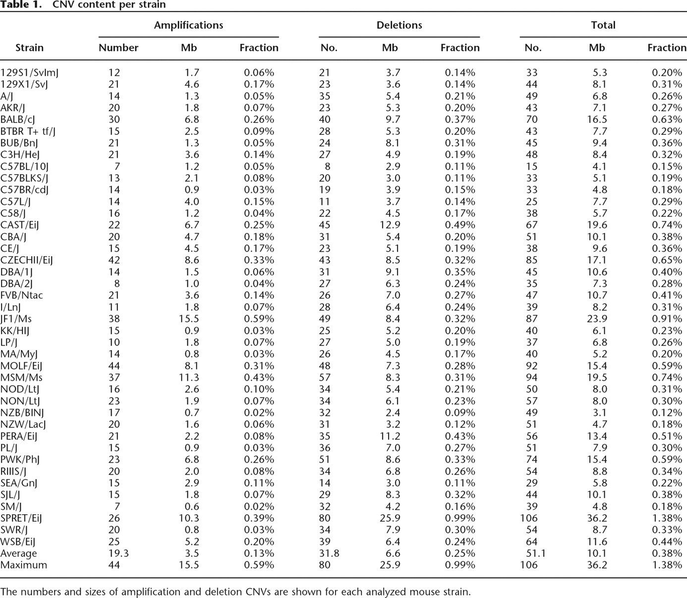 The numbers and sizes of amplification and deletion CNVs are shown for each analyzed mouse strain.