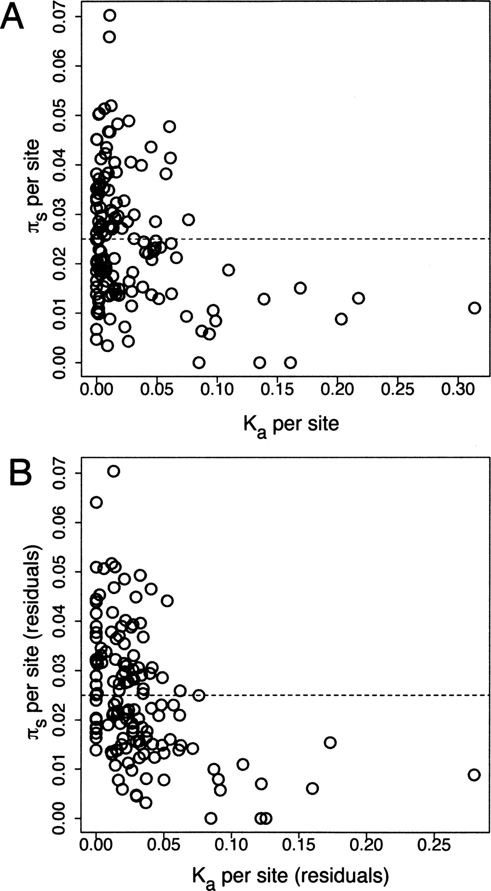 Reduced levels of synonymous site diversity associated with in high rates of protein evolution in D. melanogaster. (A) Raw estimates of synonymous site diversity (πS) vs. nonsynonymous divergence (Ka). (B) Partial correlation residuals of πS versus Ka, correcting for KS. Negative residuals have been set to zero. (Dashed lines) Weighted average diversity across loci.