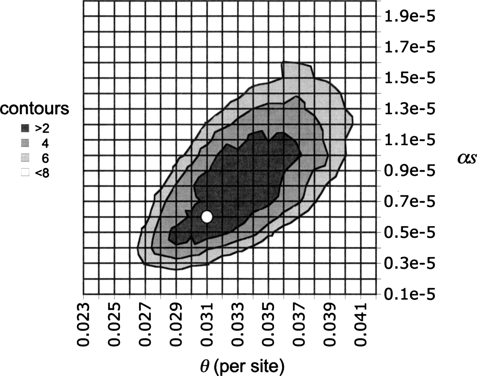 Joint likelihood surface for θ and αs under the recurrent hitchhiking model. (White circle) Maximum likelihood estimate. Each contour represents two units of log likelihood.