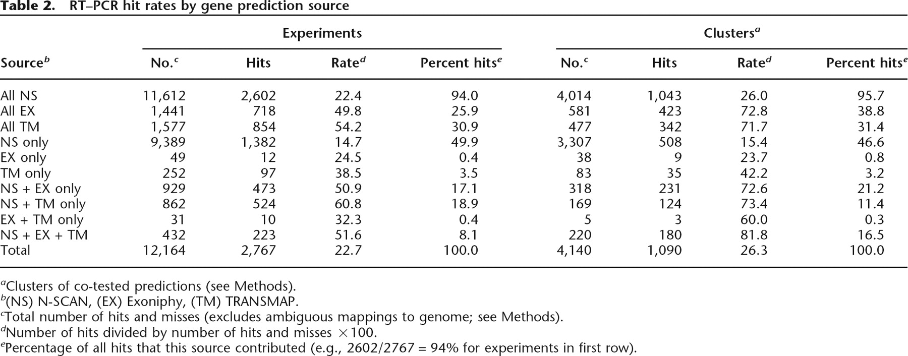 ePercentage of all hits that this source contributed (e.g., 2602/2767 = 94% for experiments in first row).