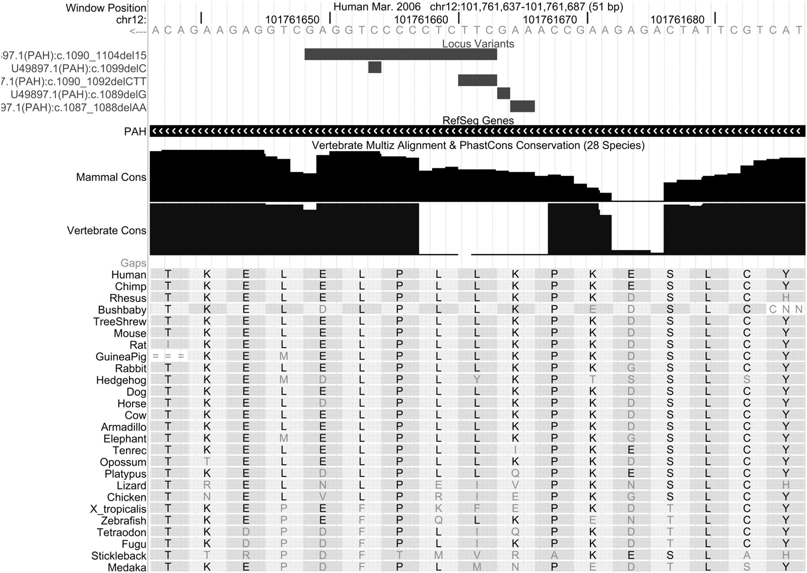 A segment of the gene for PAH, showing positions of some deletions that may be associated with the disease PKU. The CTT deletion (shown in reverse orientation) removes an amino acid whose column has six distinct letters and in that sense is not well conserved. The nucleotide symbol “N” represents an unsequenced base, and “=” indicates that at this location in the aligning species there is a sequence of bases of such different length and/or sequence composition that it cannot be reliably aligned. The two conservation tracks indicate that the deleted position is not well conserved among all vertebrates, but is fairly well conserved within mammals. chr12:101,761,637–101,761,687.