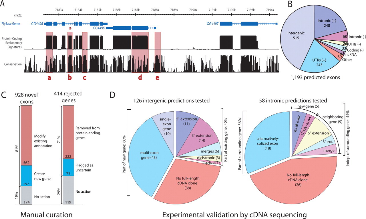 New protein-coding exons predicted by evolutionary signatures, examined by manual curation, and validated by cDNA sequencing. (A) The “Evolutionary Signatures” track shows the posterior probability of a protein-coding state in a probabilistic model integrating the RFC and CSF metrics. The “Conservation” track shows the analogous quantity from a model measuring nucleotide conservation only (Siepel et al. 2005). Note the high protein-coding scores of known exons despite lower nucleotide conservation (a,d), the low protein-coding scores of conserved noncoding regions (c,e), and the prediction of a novel exon within an intron of CG4495 (b), subsequently validated (see Fig. 3). Rendered by the UCSC Genome Browser (Kent et al. 2002). (B) Distribution of 1193 new exon predictions throughout the genome. (C) Newly predicted exons were examined by manual curation, 81% leading to new and modified FlyBase gene annotations. Additionally, curation of genes rejected by evolutionary signatures led to the recognition of hundreds of spurious annotations. (D) A sample of predicted new exons was tested by cDNA sequencing with inverse PCR. Surprisingly, 44% of the validated predictions in “intronic” regions revealed a transcript independent of the surrounding gene, and 40% of the validated predictions in “intergenic” regions were part of existing genes. See Fig. 3 for examples.