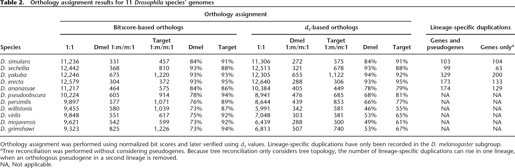 Orthology assignment was performed using normalized bit scores and later verified using dS values. Lineage-specific duplications have only been recorded in the D. melanogaster subgroup.