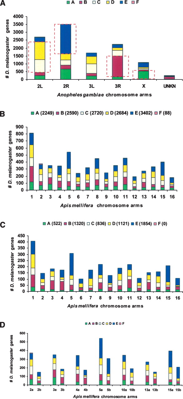 Impact of PRGs on more distant genome comparisons. (A) Chromosome arm correspondence between D. melanogaster and A. gambiae. Arm correspondence was inferred based on majority of D. melanogaster orthologous genes (from Muller elements A–F) found on A. gambiae chromosome arms. For example, Drosophila Muller E corresponds to A. gambiae arm 2R. Other relationships were inferred as follows: Drosophila A and A. gambiae X, B and 3R, C and 2L, D and 2L. Genes in these sets (shown boxed) are inferred to colocalize on an ancestral chromosome arm that was the primary contributor to the extant arms in these species. (B) D. melanogaster orthology with A. mellifera (honeybee). D. melanogaster genes (number of genes in the query set are shown in parentheses for each Muller element) with orthologs are distributed across various arms of A. mellifera. (C) Orthology with inferred ancestral colocated set from A. The set of ancestrally colocated D. melanogaster genes shown boxed in A, are mapped across various arms of A. mellifera. Numbers in parentheses show the number of genes from each Drosophila Muller element that are part of this query set. This mapping filters out noise due to PRGs over this long evolutionary distance and highlights contributions of ancestral arms to the honeybee genome organization. For example, the ancestral arm corresponding to D. melanogaster Muller element E and A. gambiae arm 2R is the primary contributor to honeybee chromosome 5. (D) Removal of PRGs enhances correlated chromosomal locations between honeybee and Drosophila. A side-by-side comparison of orthology using all D. melanogaster genes versus the inferred colocated set from A shows how reducing the contributions of PRGs enriches the signal from primary arm contributors. For example, eliminating PRGs from A. mellifera chromosome 5 (5a vs. 5b) and chromosome 15 (15a vs. 15b) shows the ancestral arm corresponding to Drosophila Muller element E (A. gambiae 2R) as the primary contributor. Similarly, contributions of the ancestral arm corresponding to Drosophila Muller element B (A. gambiae 3R) stand out for A. mellifera chromosomes 3 and 4.