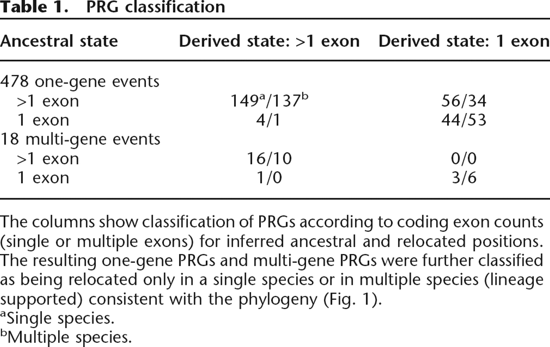 The columns show classification of PRGs according to coding exon counts (single or multiple exons) for inferred ancestral and relocated positions. The resulting one-gene PRGs and multi-gene PRGs were further classified as being relocated only in a single species or in multiple species (lineage supported) consistent with the phylogeny (Fig. 1).