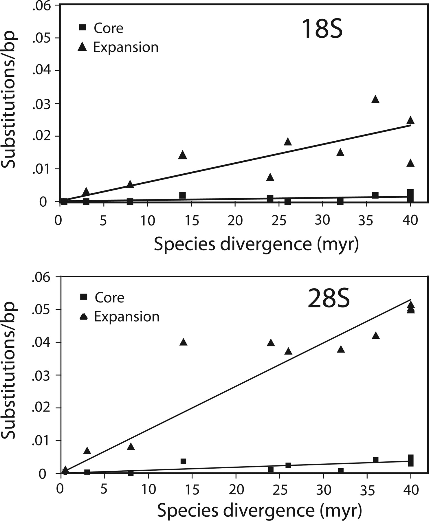 Nucleotide substitution rates for the core and expansion regions of the 18S and 28S genes. Divergence between sequences was calculated as the number of differences per aligned sequence (indels were not considered). Species pairs for which divergence was calculated were simulans vs. sechellia; melanogaster vs. each of sechellia, yakuba, ananassae, pseudoobscura, willistoni, and virilis; and finally, virilis vs. each of mojavensis, grimshawi, willistoni, and pseudoobscura. The species divergence times were those obtained from the Drosophila Species Genomes Web site (http://insects.eugenes.org/species/).
