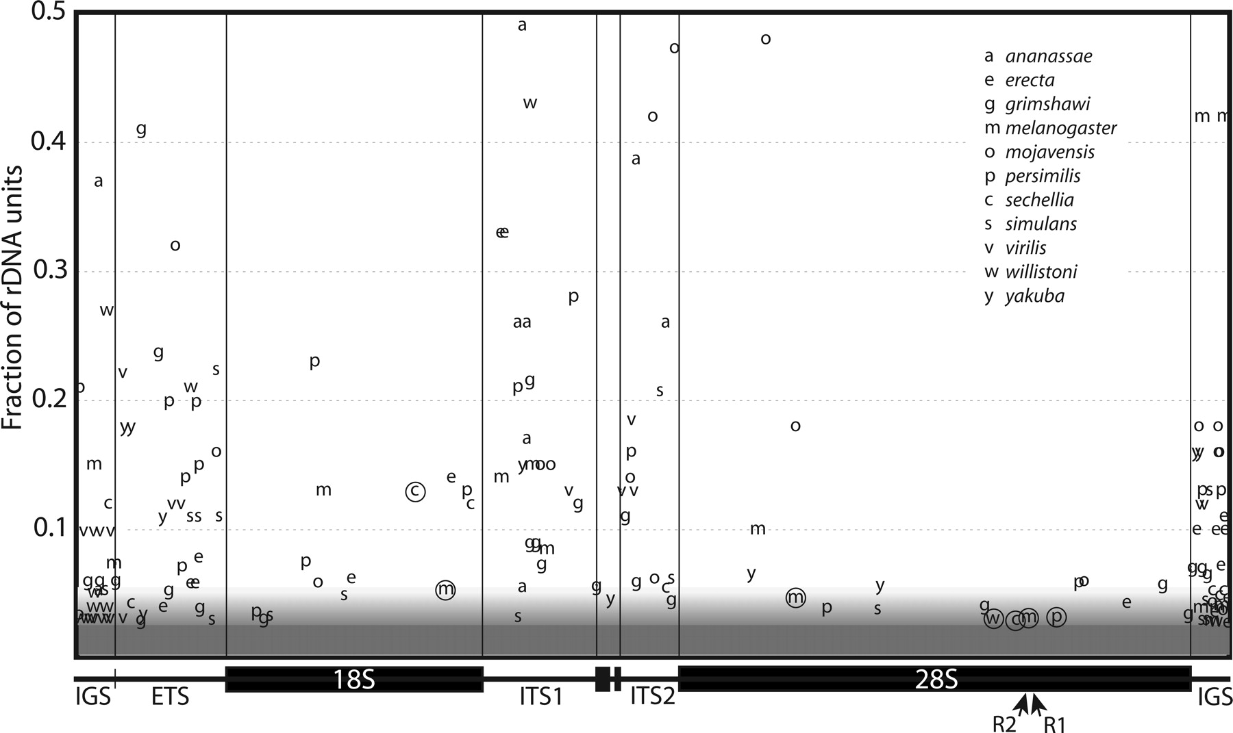 Sequence variants within the rDNA units of 11 Drosophila species. The X-axis shows the location of each variant within the unit. The Y-axis shows the fraction of the trace reads that contain the variant. The shading at the bottom of the figure indicates that variants present in <3% of the trace were not recovered by our approach. Above this 3% level, the probability of the recovery of specific variants increased with their frequency in the locus (see Methods). In all gene regions, the 3′ end of ITS1 and 5′ end of ITS2 could be aligned between species (see Fig. 4). Variant locations in the remaining regions of the ITS, the ETS, and the 300 bp of IGS flanking the ETS and 28S were based on their relative position within the region. Circled variants represent indels present in the coding regions. The location of the R1 and R2 insertion sites within the 28S gene are indicated with arrows.