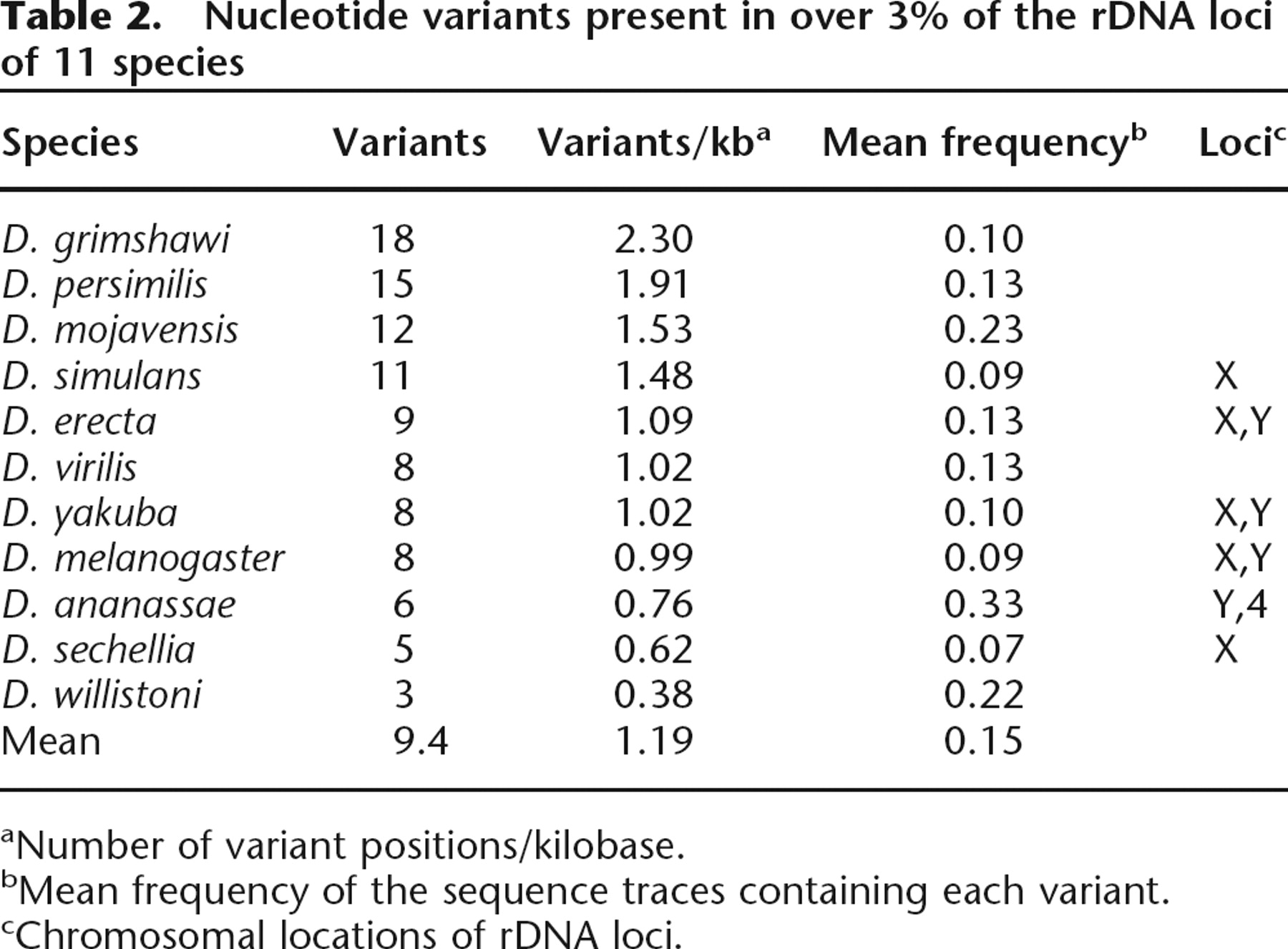 Nucleotide variants present in over 3% of the rDNA loci of 11 species