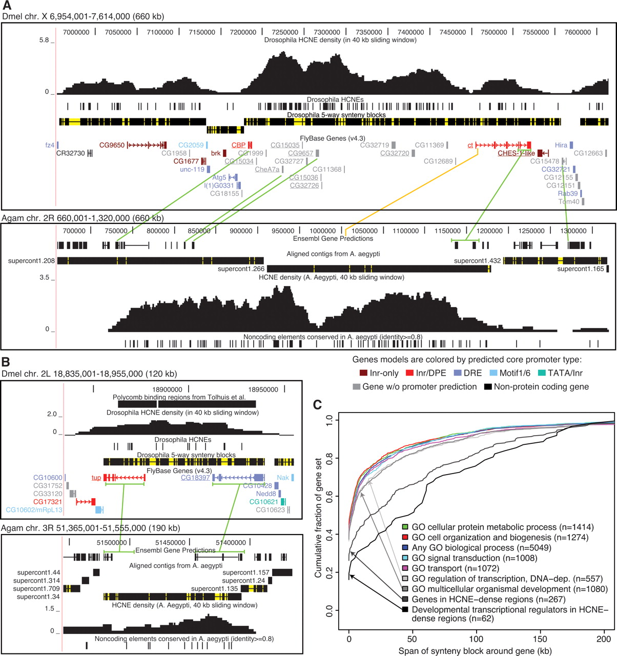Genes associated with HCNE arrays tend to be in large fly-mosquito synteny blocks. (A,B) Examples of synteny blocks. Gaps within synteny blocks are colored yellow. Green lines connect genes in conserved microsynteny between Dmel and Agam. Microsynteny conservation between Dmel and Agam was determined by examining chained BLASTZ and TBLASTN alignments in the UCSC Genome Browser (Kent et al. 2002). Sometimes only parts of genes could be matched (e.g., in the case of ct). Aaeg contigs aligned to the Agam assembly are shown with regions having ≥50% identity over 50 bp in black and other regions in yellow. HCNE densities were computed as the fraction of bases in HCNEs in sliding windows of 40 kb. The UCSC Genome Browser (Kent et al. 2002) was used in making the images. (A) The ct locus in Dmel (upper panel) and Agam (lower panel). ct and nine other genes (underlined) show strong evidence of being in conserved microsynteny among the five flies. The orange line indicates a noncoding BLASTZ match between Dmel and Agam and hints at the location of the first ct exon in Agam. Comparison of HCNE density curves also supports that the first ct exon in Agam is in the area indicated by the orange line. Supporting a common origin of the HCNE clusters at the ct loci in flies and mosquitoes, the HCNE density curves have similar shapes. Two density peaks are visible in both organisms: one between CG9657 and ct, and the other within the borders of ct. The developmental transcriptional regulator brk (Moser and Campbell 2005) is centrally positioned in an adjacent synteny block. CG9650, which dominates a neighboring HCNE-rich synteny block, is expressed in developing CNS and PNS and encodes a putative C2H2 zinc finger protein (McGovern et al. 2003). (B) The tailup (tup) locus in Dmel (upper panel) and Agam (lower panel). tup is in conserved microsynteny with CG18397 among the five flies, Agam and Aaeg. tup encodes a homeodomain transcription factor involved in development (Thor and Thomas 1997). CG18397 is predicted to encode a protein with an AMP-dependent synthetase and ligase domain. In both flies and mosquitoes, HCNEs are found throughout the synteny block. Some HCNEs are within introns of tup and CG18397. This, combined with the lack of evidence for a functional relationship between the two genes, indicates that they have been kept in proximity in order to maintain the HCNE array. (C) For each gene that we could assign to a synteny block, we measured the span of its synteny block excluding the region spanned by the gene itself (in order to control for differences in gene size). Each curve shows the cumulative distribution of synteny block span, measured in Dmel bp, around genes in a particular category. Categories were defined from GO biological process annotation and HCNE density. The category “any biological process” contains all genes annotated with a GO biological process term other than “biological process unknown.” Genes in HCNE-dense regions overlap a 40-kb region where at least 1% (400 bp) of the sequence is in HCNEs. Numbers within parentheses indicate the number of genes annotated to the indicated process and assigned to a single synteny block.