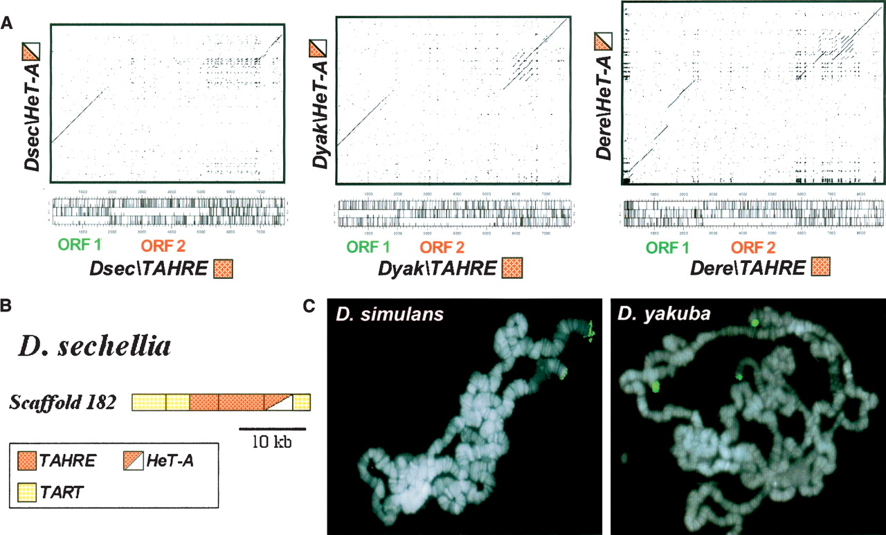 TAHRE elements in the D. melanogaster species subgroup. (A) Dot-matrix comparisons of the nucleotide sequence of each TAHRE (Dsec\TAHRE scaffold 182, 15703-7717; Dyak\TAHRE and Dere\TAHRE are listed in Supplemental Fig. S12) with its corresponding HeT-A (Dsec\HeT-A scaffold 182, 7716-2747; Dyak\HeT-A AF043258; Dere\HeT-A scaffold 4836, 38316–32346). The three-frame ORF maps of TAHRE elements are indicated (the tall tick marks correspond to stop codons; the short tick marks correspond to methionines; the ORFs are the long stretches without tall tick marks). (B) Diagram of scaffold 182 from D. sechellia. The color code for the TRs is indicated in the box below. (C) FISH of TAHRE-ORF2 probes to polytene chromosomes of D. simulans and D. yakuba. Hybridization signals are shown in green on the chromosomes counterstained with DAPI (blue).