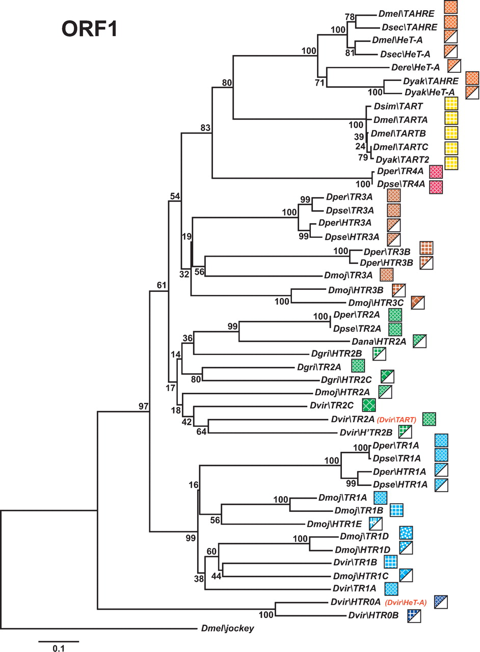 Phylogenetic relationships of TRs and HTRs based on their ORF1 domains. The tree was inferred using the neighbor-joining method. Bootstrap values are given as percentage numbers. The color code for TRs and HTRs is indicated. TART, TAHRE, and HeT-A have not been renamed to keep their historical names.