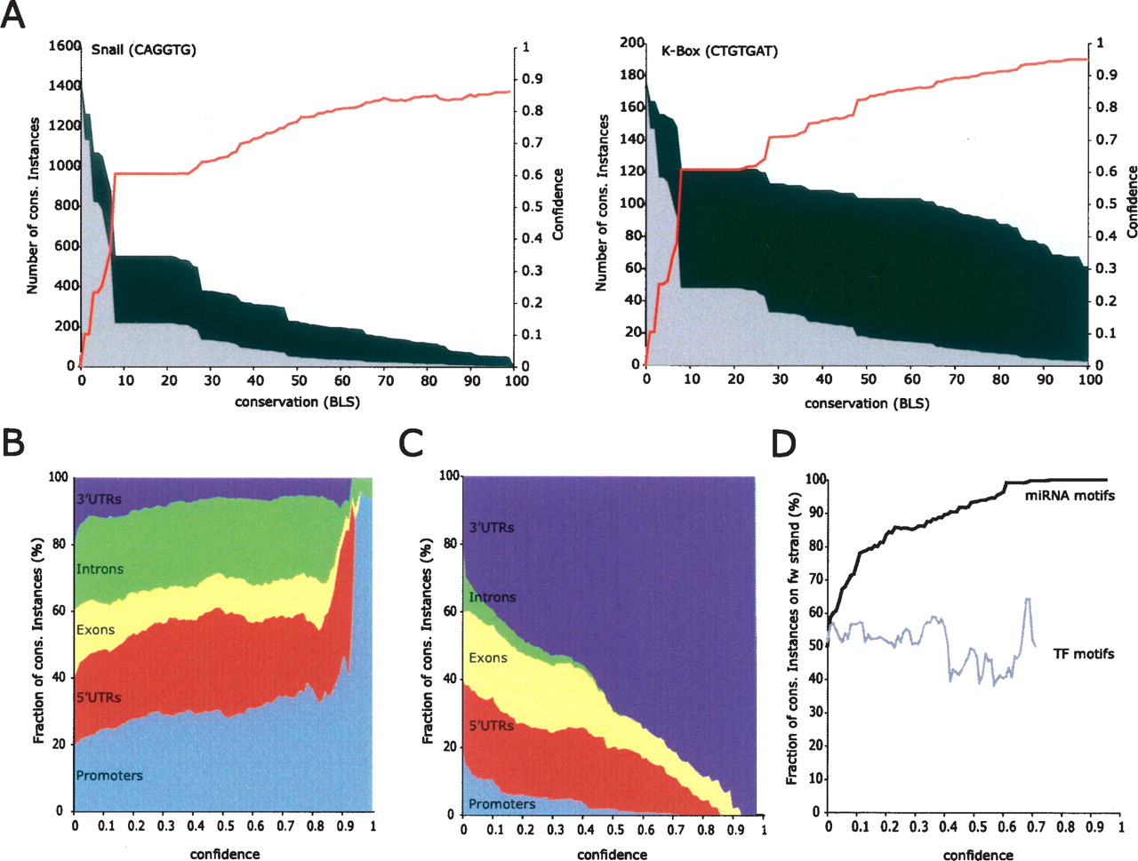 High-confidence recovery of individual motif instances. (A) Mapping BLS scores to confidence values. Recovery of conserved motif instances the transcriptional repressor Snail (CAGGTG) in promoter regions (2-kb regions upstream of transcription start sites), and the K-box miRNA (CTGTGAT) in 3′ UTRs, at different BLS cutoffs (X-axis). Instances of shuffled control motifs (gray area) decrease much more rapidly than instances of real motifs (height of black curve), leading to a large fraction of motif instances conserved above background (black area). The motif-confidence score (red line) is calculated as the fraction of conserved instances above background. Random motifs are selected to have equal frequency as real motifs at BLS = 0. (B,C) Increasing confidence values select functional motif instances. With increasing confidence cutoffs (X-axis), transcription factor (TF) motif instances fall increasingly in promoter regions (light blue), 5′ UTRs (red), and introns (green), at the exclusion of 3′ UTRs (dark blue) and coding regions (yellow). In contrast, miRNA motif instances fall increasingly into 3′ UTRs to the exclusion of promoters and other regions. Relative size of regions is normalized at BLS = 0. (D) miRNA motif instances at increasing confidence cutoffs are increasingly on the transcribed strand of 3′ UTRs (black curve), while no such trend is seen for TF motifs (gray). Curves are truncated when <10 instances reach the respective confidence.