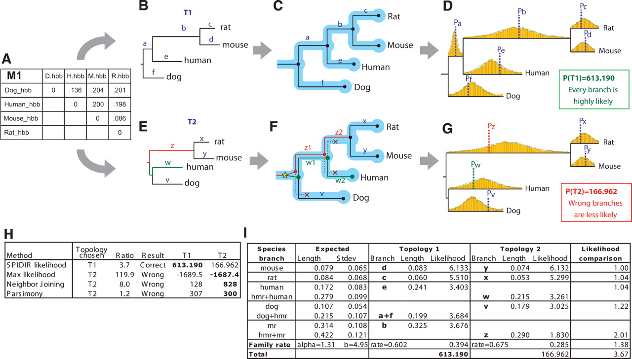 Evaluating gene-tree likelihood using learned rate distributions. (A) Observed distance matrix for mammalian orthologs of hemoglobin-β estimated from an HKY model based on multiple alignments of the four genes. (B–D) Likelihood evaluation for proposed topology T1. (B) Distance matrix M1 is mapped onto the proposed topology T1, resulting in branch lengths a–f. (C) Gene-tree branches are mapped to species-tree branches by reconciliation. Since the gene-tree topology is congruent to the species tree, each branch is mapped to exactly one lineage. (D) The probability of each branch length is evaluated based on species-specific rate distributions. T1 results in overall high-likelihood density, since the resulting relative branch lengths a–f fall near the average rate for the corresponding species-specific distribution (dotted lines). (E–G) Likelihood evaluation for proposed topology T2. (E) Distance matrix M1 is mapped onto the proposed topology T2, resulting in branch lengths v–z. (F) Reconciliation results in one gene duplication and three gene losses; gene-tree branches w and z now span two species-tree branches each and are evaluated based on accordingly longer species-tree rate distributions obtained by summing two normals. (G) The resulting branch lengths z, w, and v show large discrepancies from the average species-rate distributions, resulting in a 3.7-fold lower likelihood for branch lengths corresponding to the incorrect topology T2. (H) All other methods select the incorrect topology T2 due to long-branch attraction, even though the hemoglobin-β genes are unambiguous one-to-one orthologs and should follow the known mammalian phylogeny T1. (I) Branch-level comparison of likelihood scores shows consistently higher scores for T1, the correct topology. Notice that the gene-rate likelihood for T1 is different from that for T2, as the two topologies imply different gene family rates.