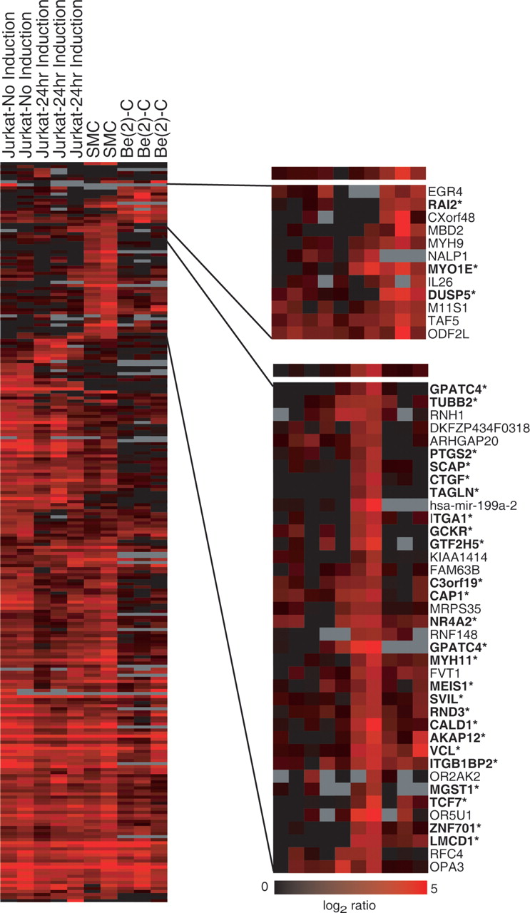 SRF binding in three cell types. For each cell type and each putative target, the intensity of red indicates size of the Z-score obtained from the arrays. The right panel displays a subset of genes bound specifically by SRF in neurons (top) and smooth muscle cells (bottom). Gene names followed by an asterisk have been validated by quantitative PCR or were previously known.
