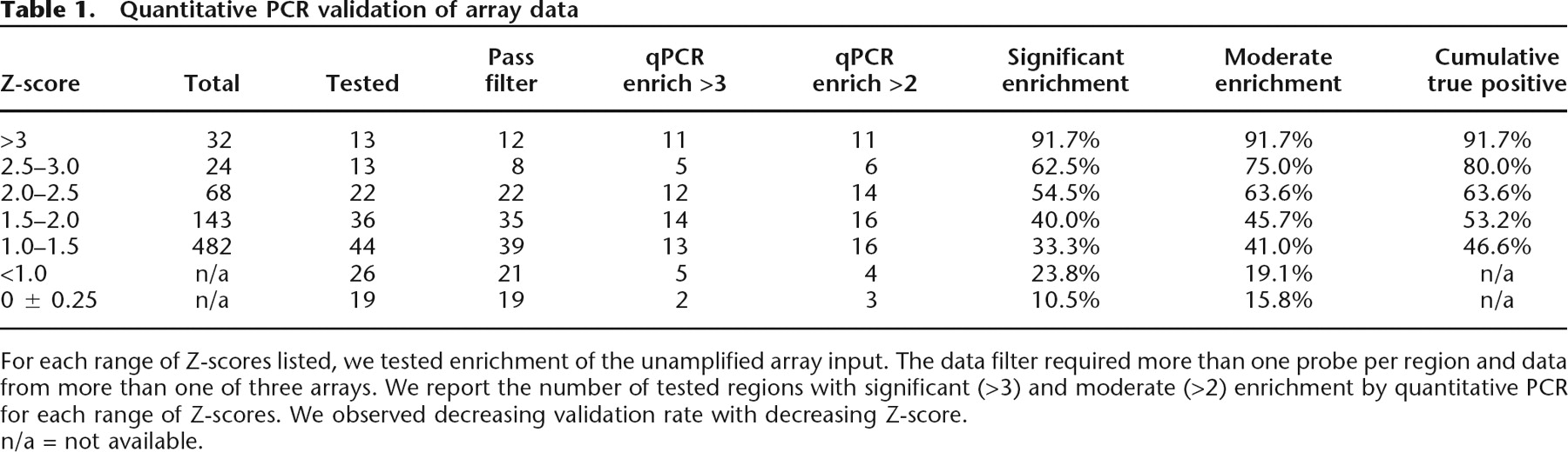 For each range of Z-scores listed, we tested enrichment of the unamplified array input. The data filter required more than one probe per region and data from more than one of three arrays. We report the number of tested regions with significant (>3) and moderate (>2) enrichment by quantitative PCR for each range of Z-scores. We observed decreasing validation rate with decreasing Z-score.