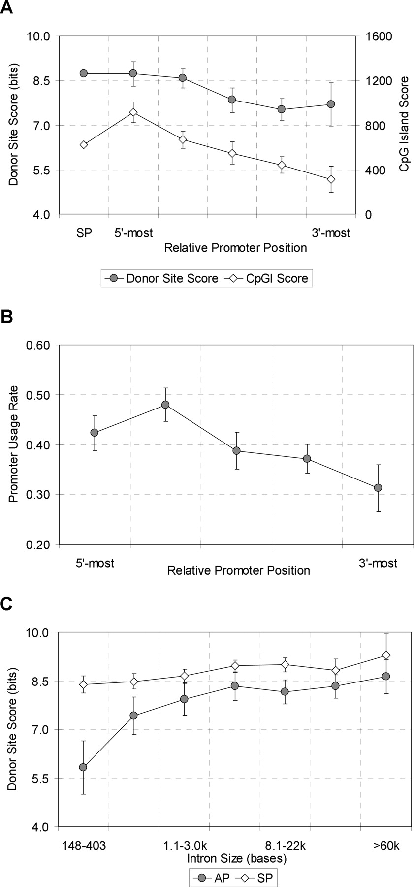 Donor site score (A), CpG island score (A), and promoter usage rate (B) as a function of relative promoter position, and donor-site score as a function of intron size (C). In A and B, AP cases with the promoter cluster size of ≥2 in both human and mouse were analyzed.
