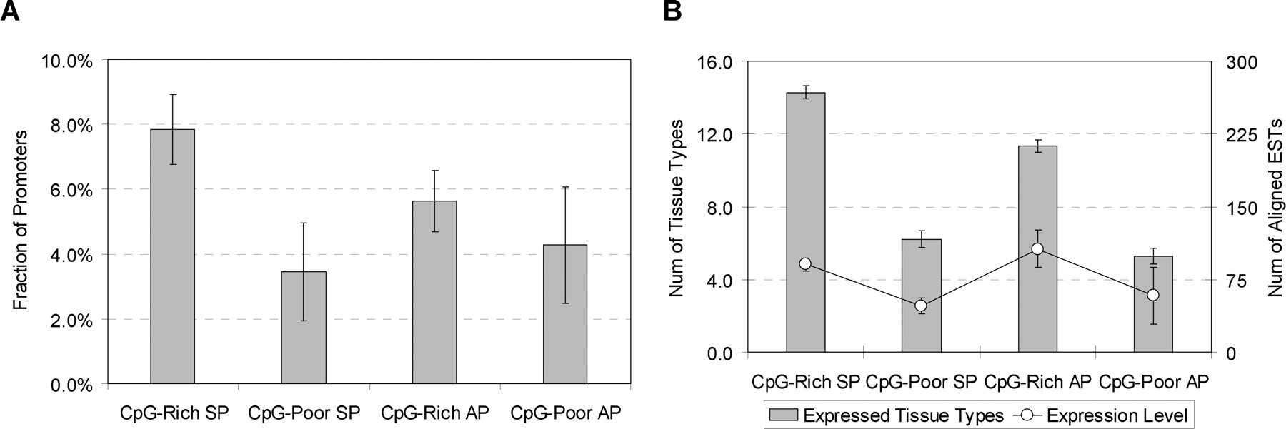 Relative prevalence of putative housekeeping promoters (A), and the number of expressed tissue types and expression level (in noncancer cells) per promoter (B) by promoter type. CpG-rich SPs are enriched for putative housekeeping promoters (A) and tend to be expressed more broadly (B). We used all conserved promoters that were strongly predicted by our discriminator to be AP or SP (having aLLRs in the top and bottom quartiles of the aLLR distribution, respectively).