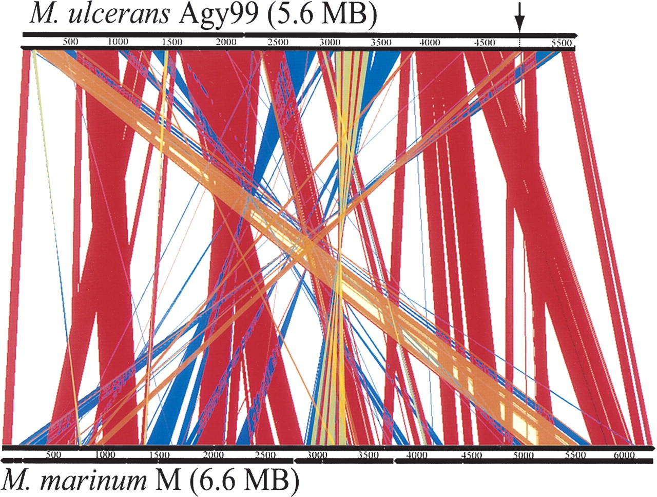 Diagram depicting the rearrangements in, and deletions from, the genome of M. ulcerans compared with M. marinum. The figure shows a linear genomic comparison generated with ACT (Carver et al. 2005). (Red lines) Regions of DNA:DNA identity, (blue lines) inverted regions, (orange) strand-displacing rearrangements, (arrow) position of the displaced 71-kb fragment.