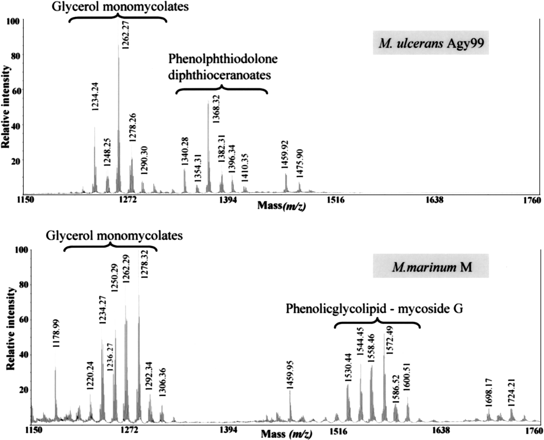 Partial matrix-assisted laser desorption ionization-time-of-flight (MALDI-TOF) mass spectra of lipids from M. ulcerans and M. marinum. These spectra show the presence of diesters of phthiocerol and phthiodiolone, and of phenolic glycolipids in M. marinum, whereas only diesters of phthiodiolone and phenolphthiodiolone occur in M. ulcerans.