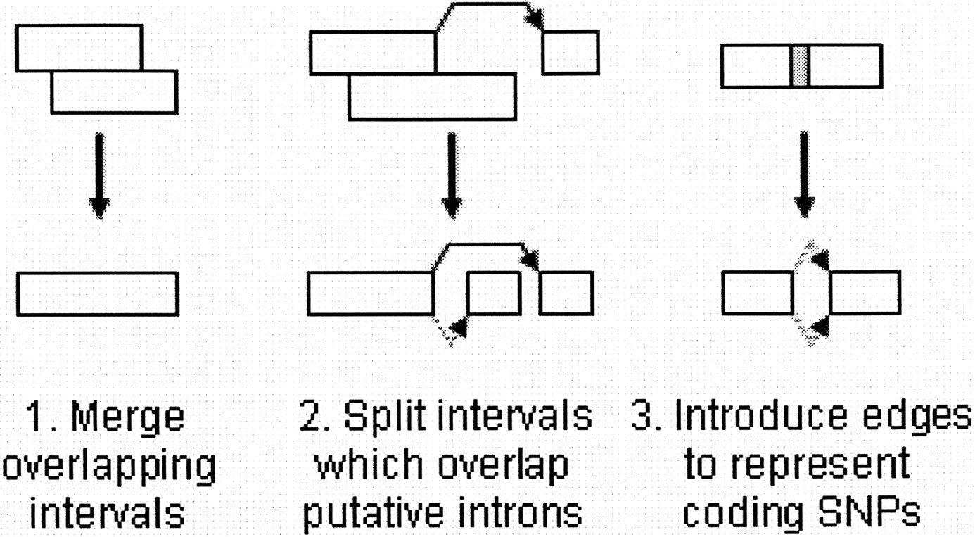 Overview of the procedure for turning a collection of putative exons and introns into an exon graph. Adjacent edges are represented by dotted lines, splice events by solid lines.