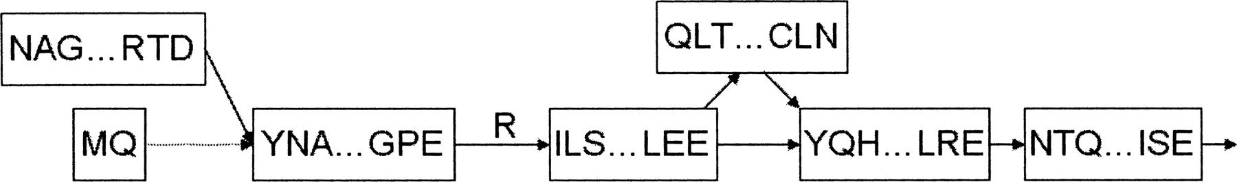 A portion of the exon graph for heterogeneous nuclear ribonuclear protein K. The labeled edge represents a codon split across a splice junction. The dotted edge is an “adjacent edge” corresponding to a longer form of an exon. Searching the exon graph reveals peptides spanning both outgoing edges from the central node, confirming alternative splicing at the level of translation.