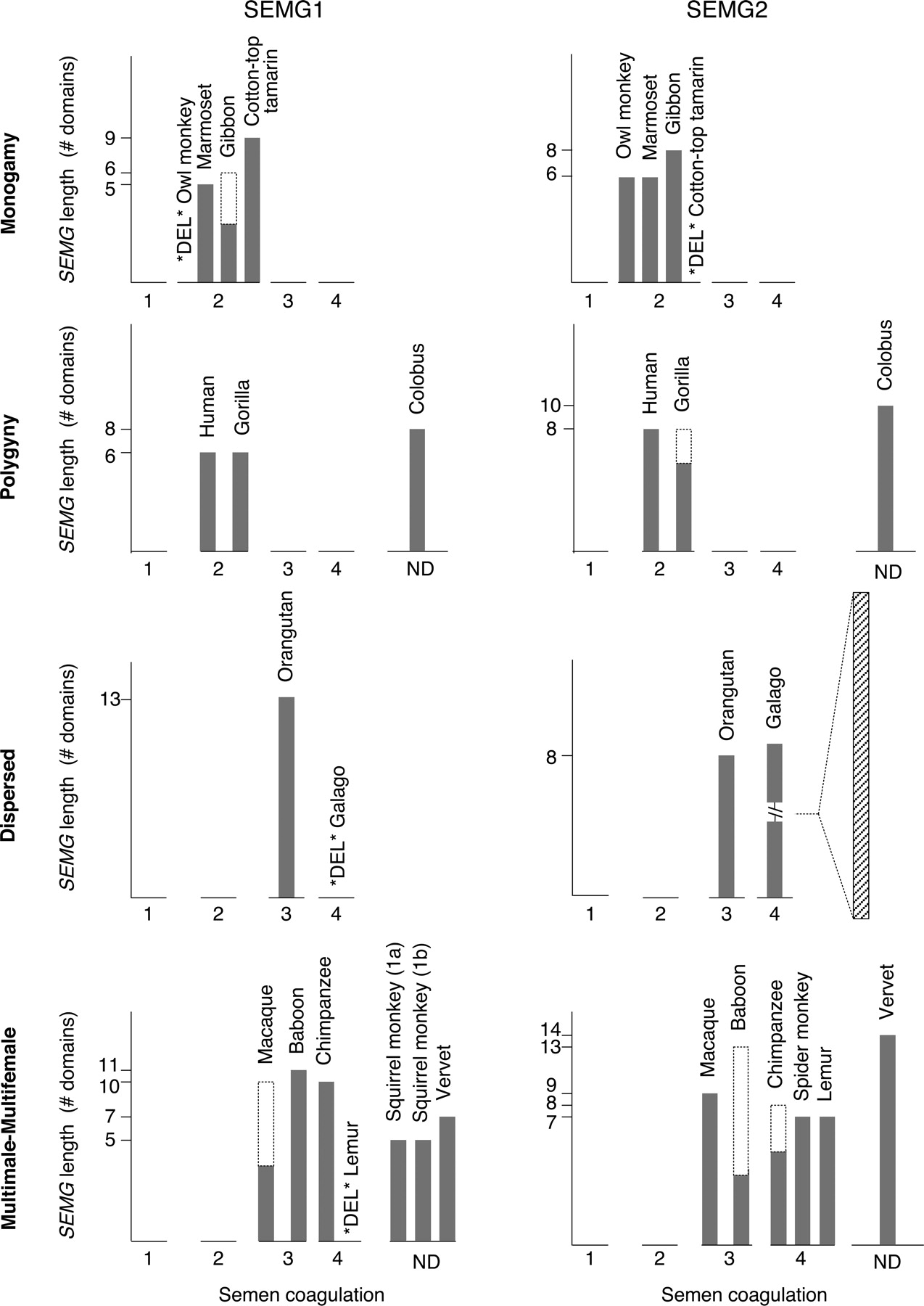 Relationships of semen coagulation, SEMG protein length, and mating system among primates. Primates are grouped according to their established mating system (Dixson 1997): monogamy, polygyny, dispersed, and multimale–multifemale. Semen coagulation is rated on a four-point scale (Dixson and Anderson 2002), with 1 reflecting no coagulation and 4 reflecting the production of a solid copulatory plug (ND, semen coagulation data not available). The indicated gray bars reflect the number of repetitive domains (each 60 amino acids in length) per SEMG protein, indicated for SEMG1 (left) and SEMG2 (right). Open bars represent predicted truncated proteins due to a premature stop codon or frameshift. SEMG genes that are deleted or nearly deleted are indicated by *DEL* before the species name. The hatched bar for galago SEMG2 indicates a ∼3-kb galago-specific inserted sequence encoding 77 additional domains (each 13 amino acids in length). The sequences for gibbon SEMG1 and SEMG2, cotton-top tamarin SEMG2, and spider monkey SEMG2 were obtained from the public databases (see Methods). Squirrel monkey has no SEMG2 gene, but contains two copies of a SEMG1 gene that may be the product of a gene-conversion event (yielding SEMG1a and SEMG1b, respectively).