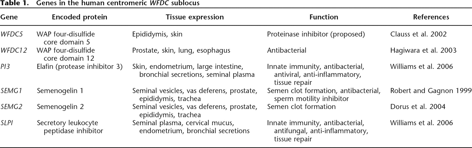Genes in the human centromeric WFDC sublocus