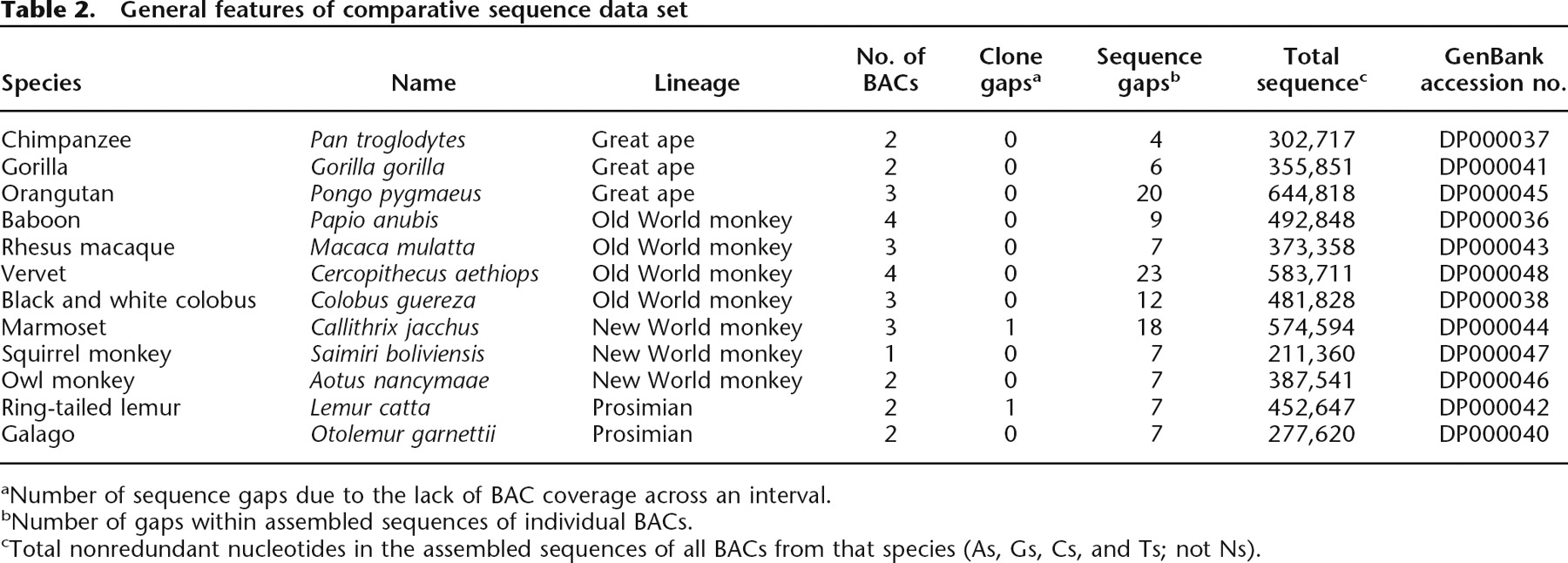 cTotal nonredundant nucleotides in the assembled sequences of all BACs from that species (As, Gs, Cs, and Ts; not Ns).