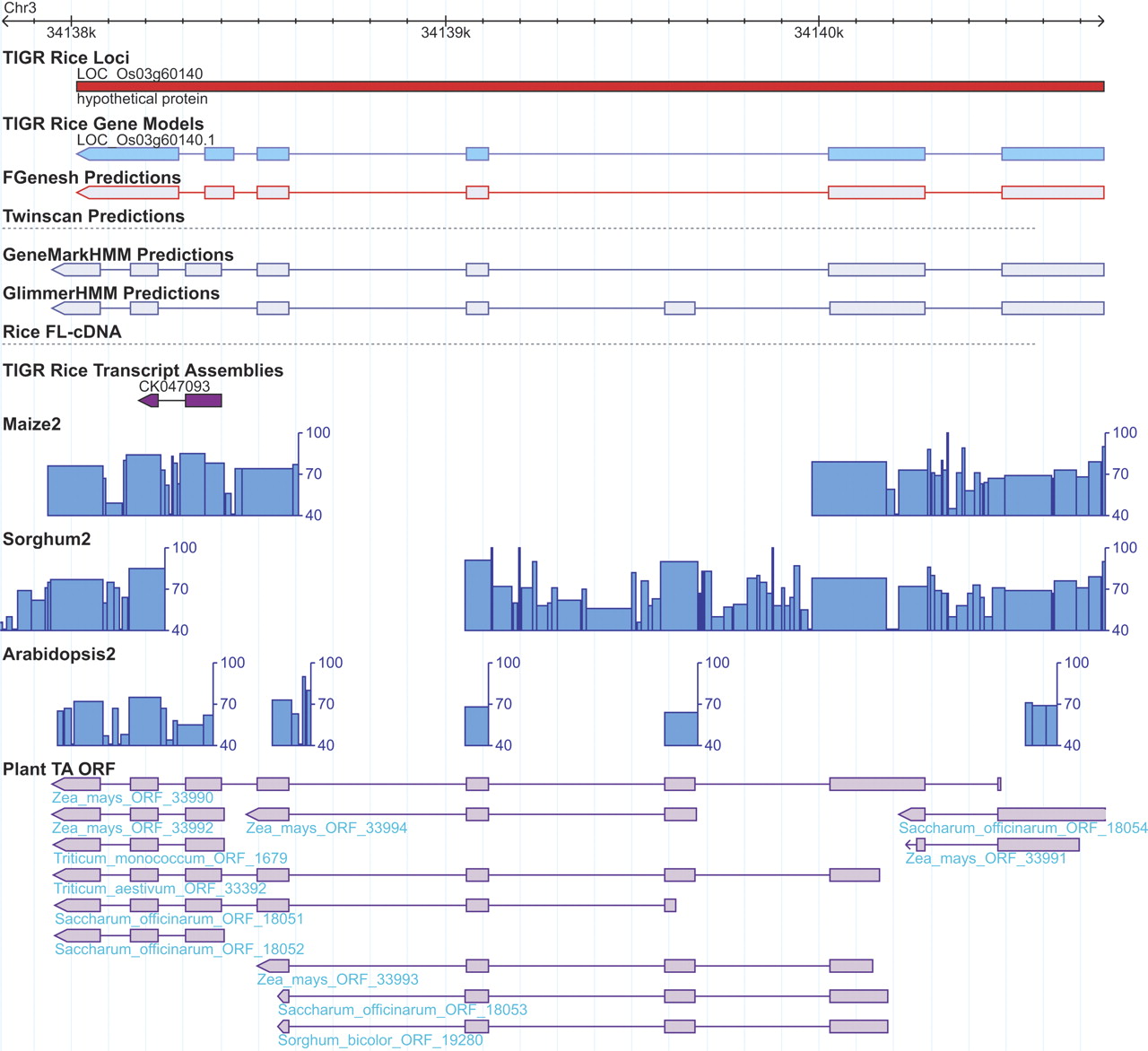 Gene structure of the hypothetical gene LOC_Os03g60140 corrected by the cross-species spliced alignments. Symbols are as in Fig. 1. It appears that there is an exon missed in the second intron of LOC_Os03g60140 and the correct gene structure is shown via cross-species alignments but not correct by any gene finders.