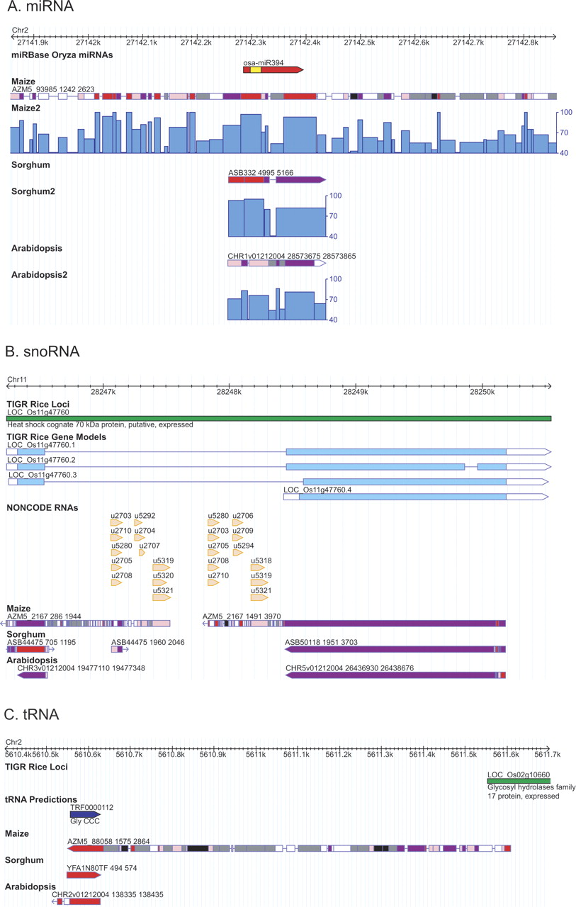 Conserved noncoding RNAs: (A) miRNA, (B) snoRNA, and (C) tRNA. (A) The precursor miRNA transcript osa-miR394 is represented by the red bar with the arrow for the orientation and the mature miRNA sequence is highlighted in yellow color which is significantly more conserved in maize, sorghum, and Arabidopsis than the neighboring intergenic or intronic regions. The snoRNA (B) and tRNA (C) features are represented by arrowed bars in orange and blue, respectively.