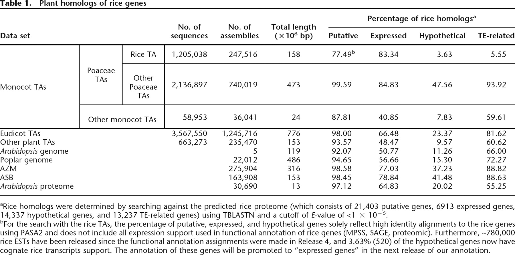 aRice homologs were determined by searching against the predicted rice proteome (which consists of 21,403 putative genes, 6913 expressed genes, 14,337 hypothetical genes, and 13,237 TE-related genes) using TBLASTN and a cutoff of E-value of <1 × 10−5.