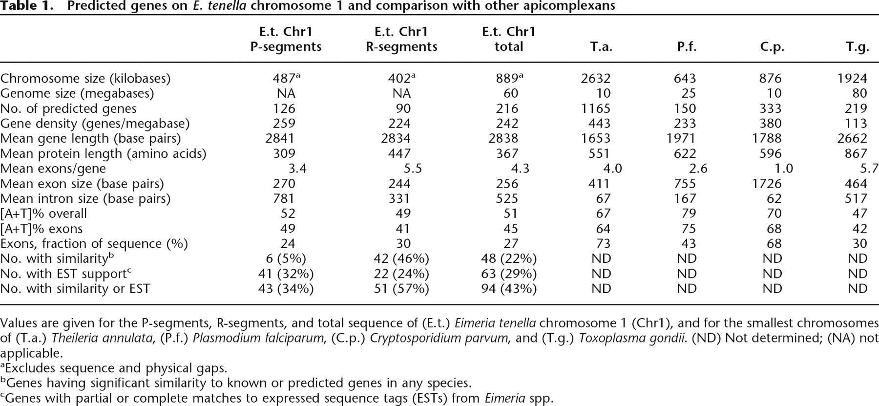 Values are given for the P-segments, R-segments, and total sequence of (E.t.) Eimeria tenella chromosome 1 (Chr1), and for the smallest chromosomes of (T.a.) Theileria annulata, (P.f.) Plasmodium falciparum, (C.p.) Cryptosporidium parvum, and (T.g.) Toxoplasma gondii. (ND) Not determined; (NA) not applicable.