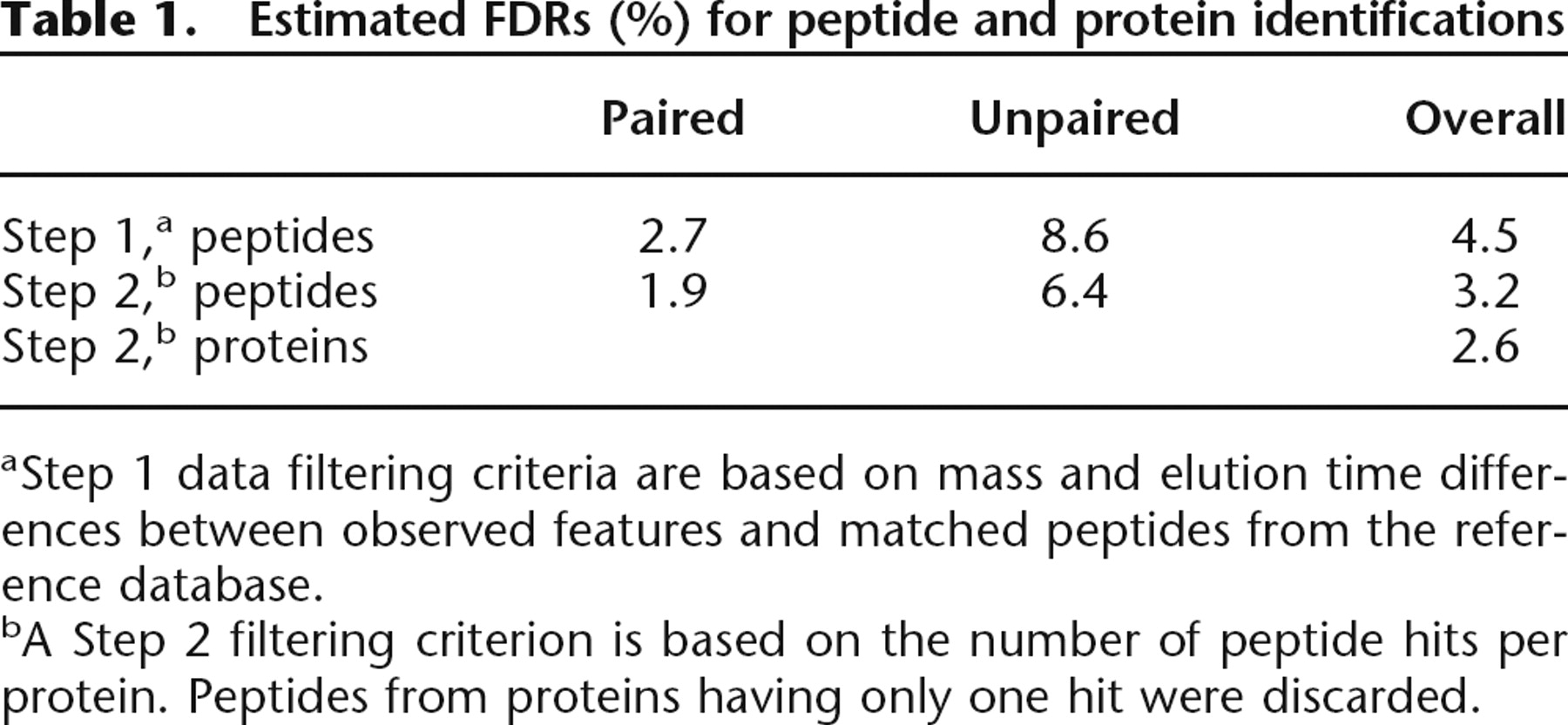 aStep 1 data filtering criteria are based on mass and elution time differences between observed features and matched peptides from the reference database.
