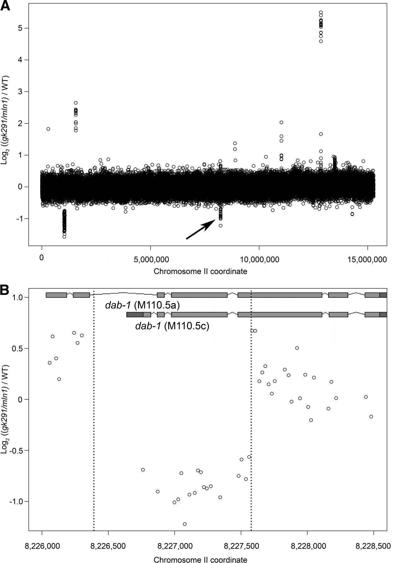 Detection of the 1202-bp deletion in dab-1 (gk291) in a wash-sampled balanced heterozygous population. (A) The normalized log2 ratios [(dab-1(-)/mIn1)/WT] of the average fluorescence intensities for probe pairs to chromosome II are plotted. The arrow indicates the dab-1 deletion (other features are discussed in the text). (B) Normalized fluorescence ratios for probe pairs targeting dab-1 are shown. Sequenced deletion breakpoints are indicated by dotted lines and were accurately predicted by CGH. The left breakpoint lies within the second intron. Overlapping probes targeting the right breakpoint span just 73 bp, allowing resolution of the right breakpoint to within fewer than 50 bp.