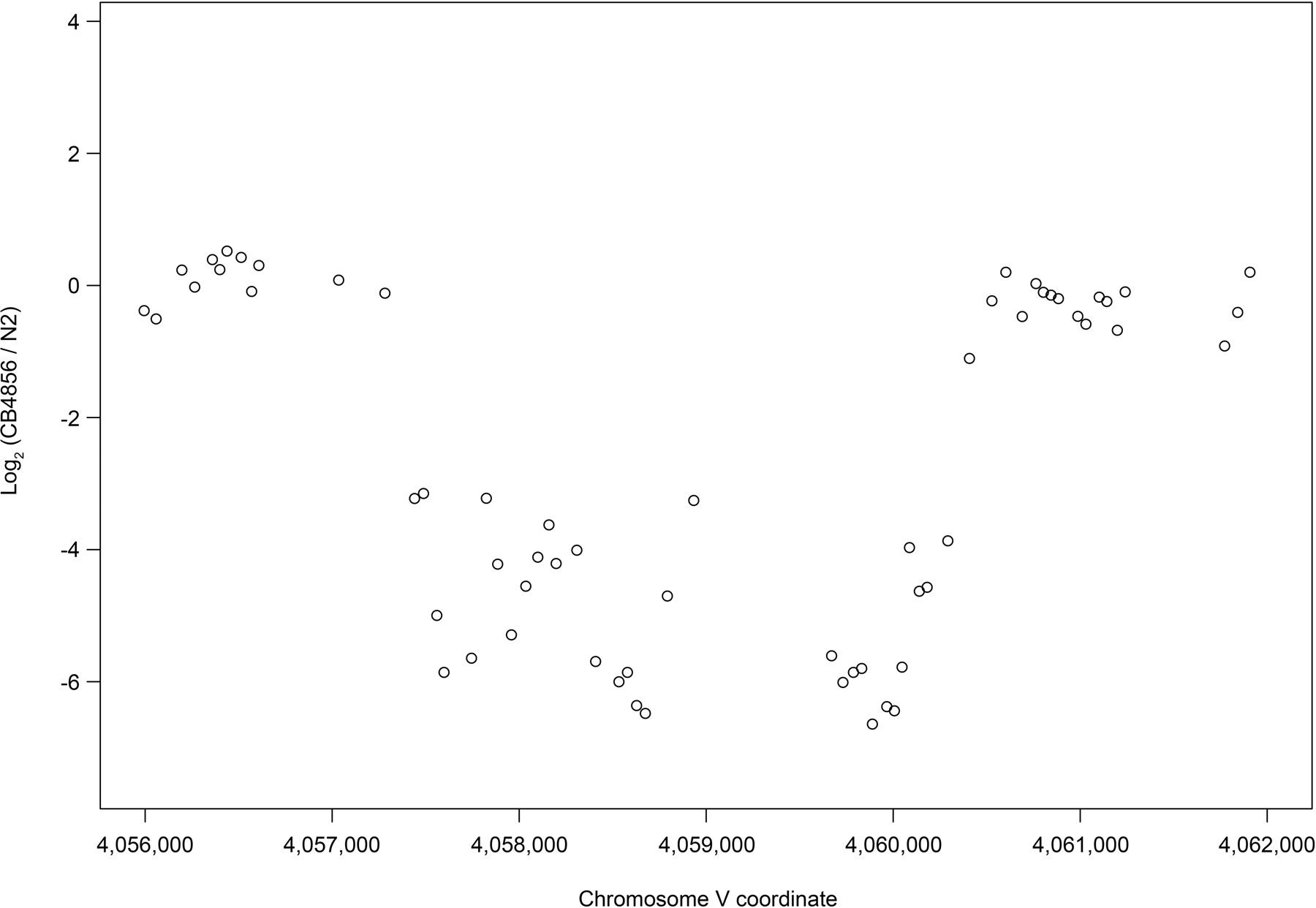 A homozygous viable deletion identified on chromosome V in the Hawaiian strain (CB4856). Normalized log2 ratios (CB4856/N2) indicate that the deletion targets the genes C49G7.1 and D1065.3.