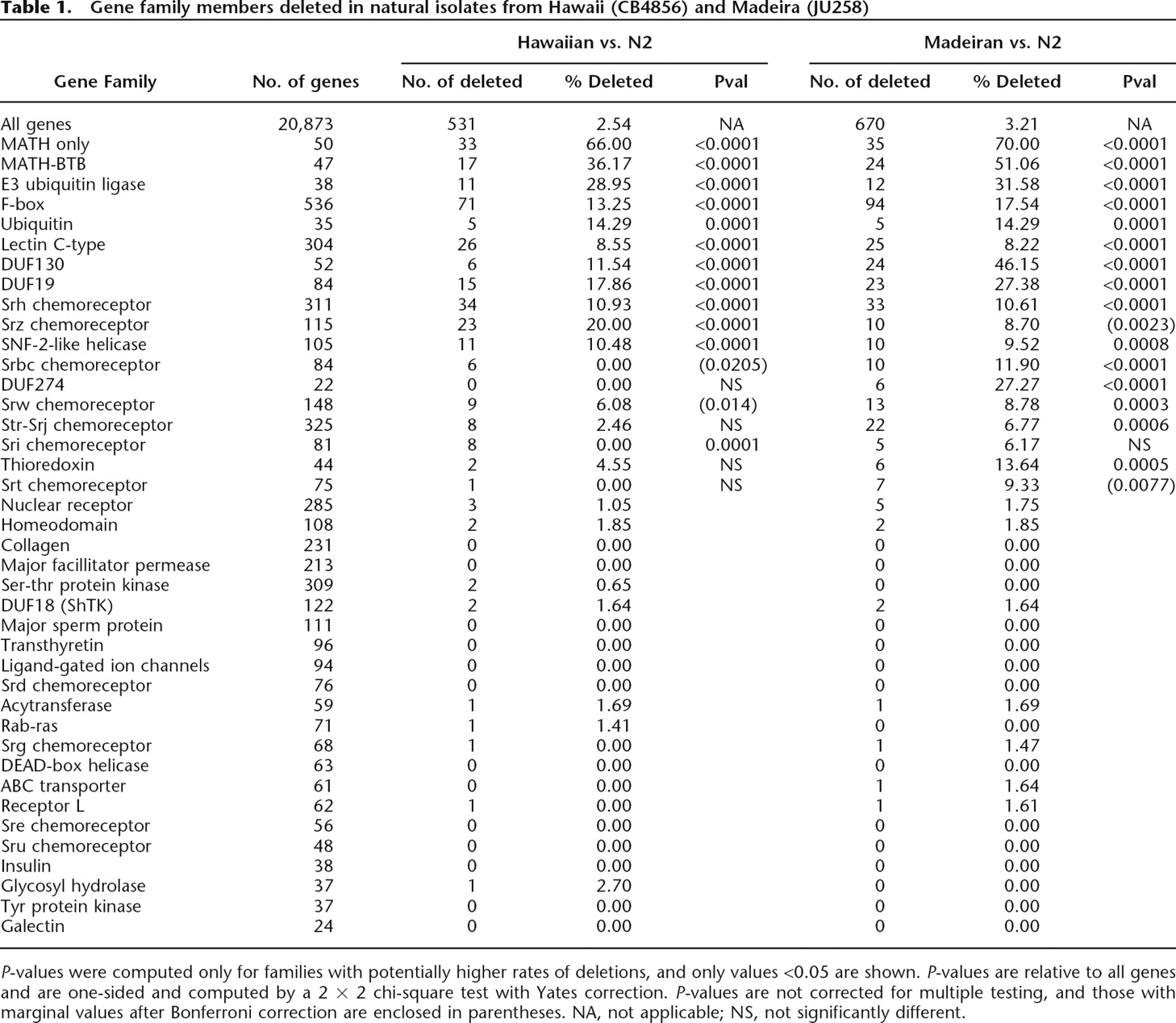 P-values were computed only for families with potentially higher rates of deletions, and only values <0.05 are shown. P-values are relative to all genes and are one-sided and computed by a 2 × 2 chi-square test with Yates correction. P-values are not corrected for multiple testing, and those with marginal values after Bonferroni correction are enclosed in parentheses. NA, not applicable; NS, not significantly different.