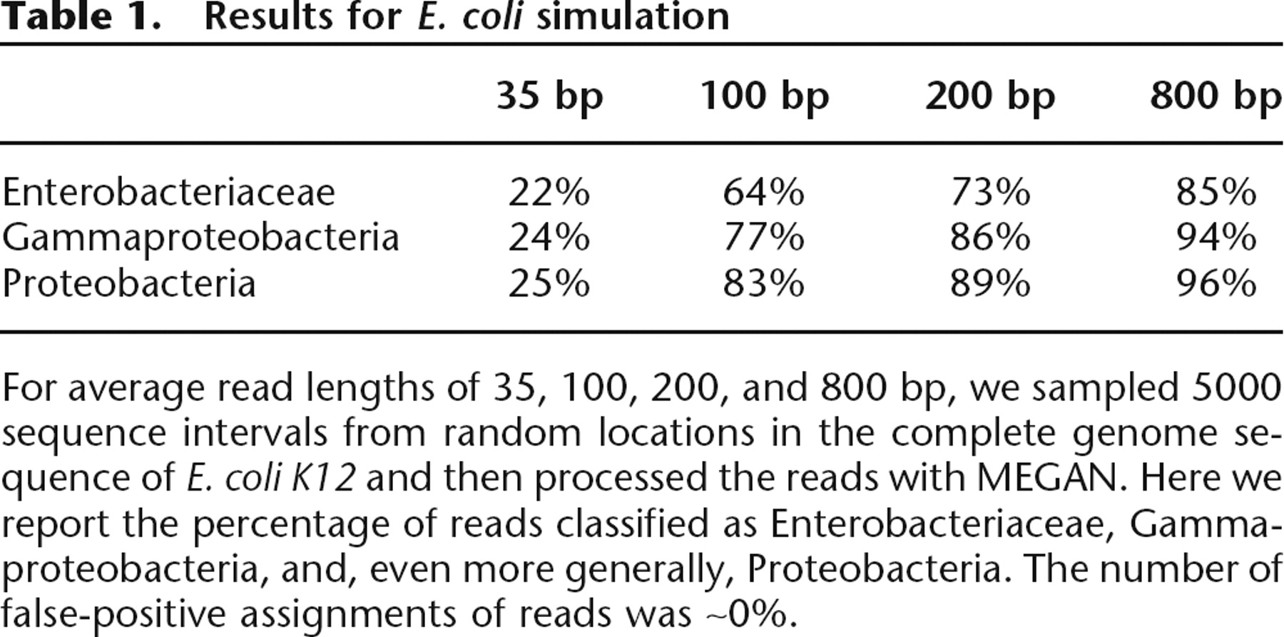 For average read lengths of 35, 100, 200, and 800 bp, we sampled 5000 sequence intervals from random locations in the complete genome sequence of E. coli K12 and then processed the reads with MEGAN. Here we report the percentage of reads classified as Enterobacteriaceae, Gammaproteobacteria, and, even more generally, Proteobacteria. The number of false-positive assignments of reads was ∼0%.