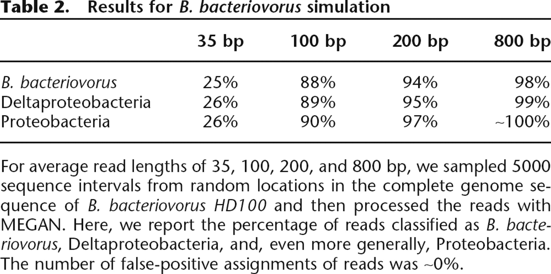For average read lengths of 35, 100, 200, and 800 bp, we sampled 5000 sequence intervals from random locations in the complete genome sequence of B. bacteriovorus HD100 and then processed the reads with MEGAN. Here, we report the percentage of reads classified as B. bacteriovorus, Deltaproteobacteria, and, even more generally, Proteobacteria. The number of false-positive assignments of reads was ∼0%.