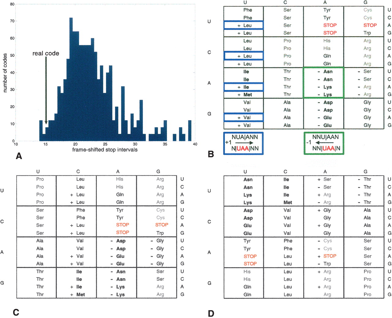 Optimality of the genetic code for minimizing the impact of frame-shift translation errors. (A) Distribution of average number of translated codons until a stop codon is encountered after a frame-shift event for the alternative genetic codes. This number corresponds to the mean length of the nonsense polypeptide translated after a frame-shift event, and is the inverse of the frame-shifted stop probability, averaged over the +1 and −1 frame-shifts. (B) In the real code, frame-shifted stop codons overlap with abundant codons. Codons with two-letter overlap with a stop codon are marked by + for a +1 frame-shift and – for a −1 frame-shift. Abundant codons are shown in heavier font. For example, the stop codon UAA, when frame shifted, results in codons such as AAN (green box), or NUA (blue boxes), which are relatively abundant. (C) The “best code,” which achieves the highest frame-shifted stop probability both in a +1 frame-shift and in a −1 frame shift. Stop codons are CAA, CAG, and CGA. In the “best code,” a stop codon has an overlap of two positions with codons of Glycine instead of codons of Serine and Arginine in the real code. (D) The “worst code” with the lowest frame-shifted stop probability. Stop codons are AUA, AUG, and AAA. Note that the stop codons overlap either with themselves (AAA) or with codons for nonabundant amino-acids (those with light font), in contrast to B and C.