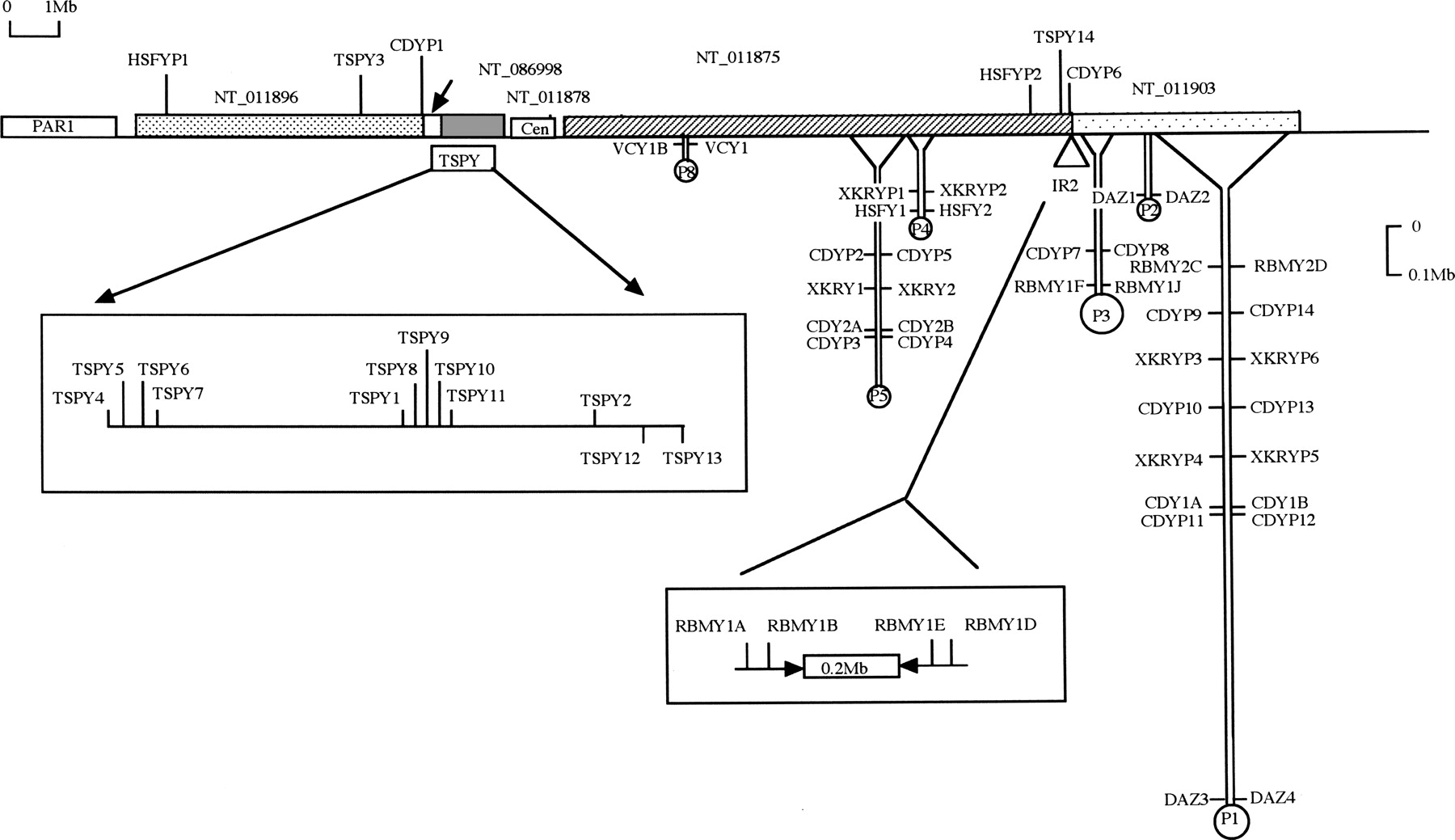 Chromosomal locations of human ampliconic genes and pseudogenes based on information about contigs, as well as MapViewer display of BLASTN results (see also Supplemental Table 1). The abscissa represents the ∼24-Mb euchromatic region with the Yp pseudoautosomal region at the left-most end. Palindromes are shown as hairpin-like structures; expanded views of the TSPY array and IR2 are shown in boxes.