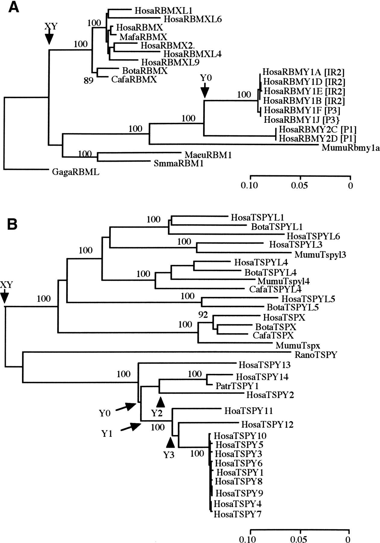 NJ trees of (A) RBMY and (B) TSPY drawn in the same way and with the same gene nomenclature system as in Figure 2. Ampliconic locations of human RBMY copies are indicated by bracketed P1, P3, and IR2.